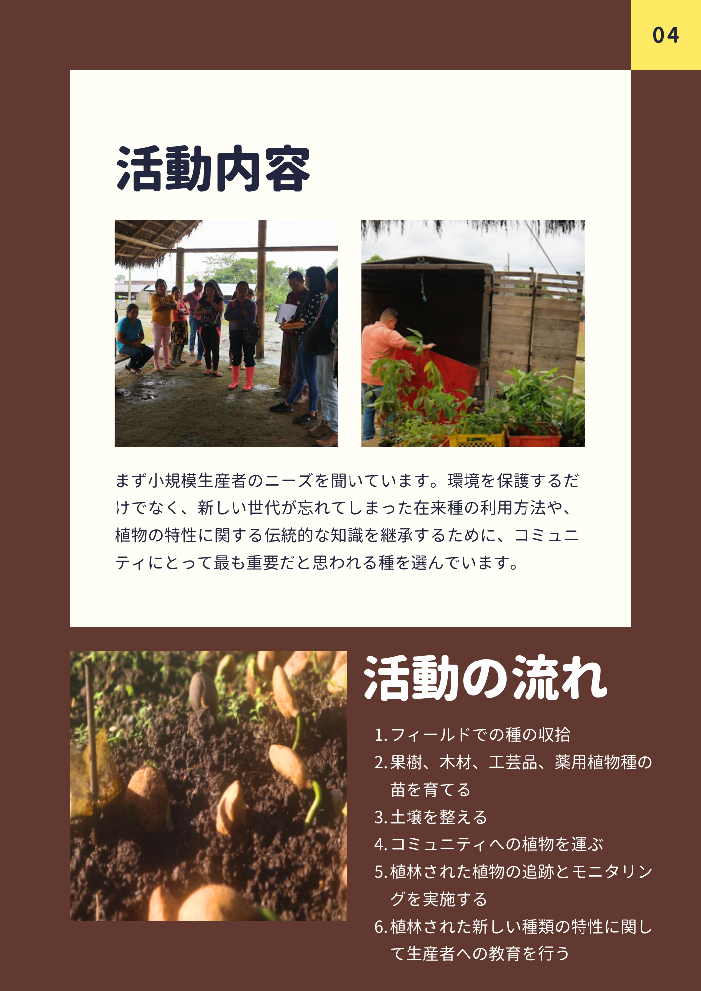 生物にとっても豊かなチャクラは住処となり、人々と共存関係築いています。ウィニャック組合では、シャキーラさんが中心となって、豊かなチャクラを育むための苗木作り、種の保存、コミュニティへの植樹を行っており、大きくは『気候変動の緩和、生物多様性、生活の質の向上』の3つを目的としています。