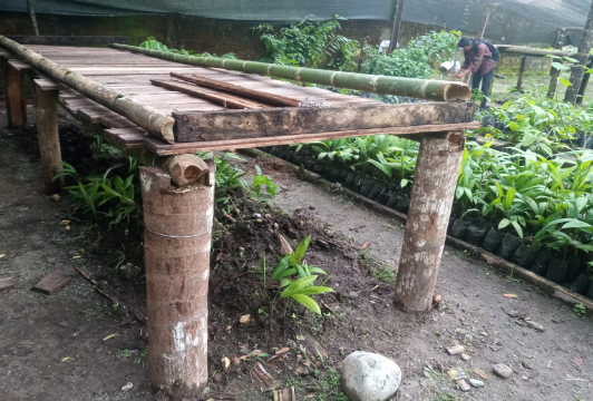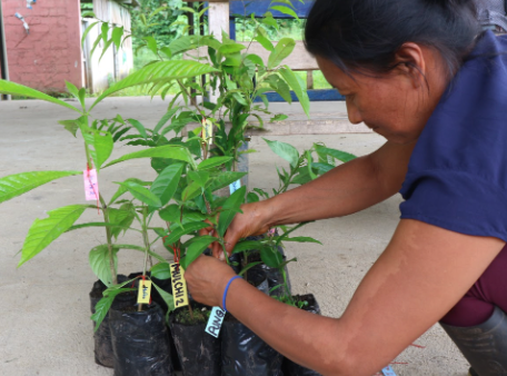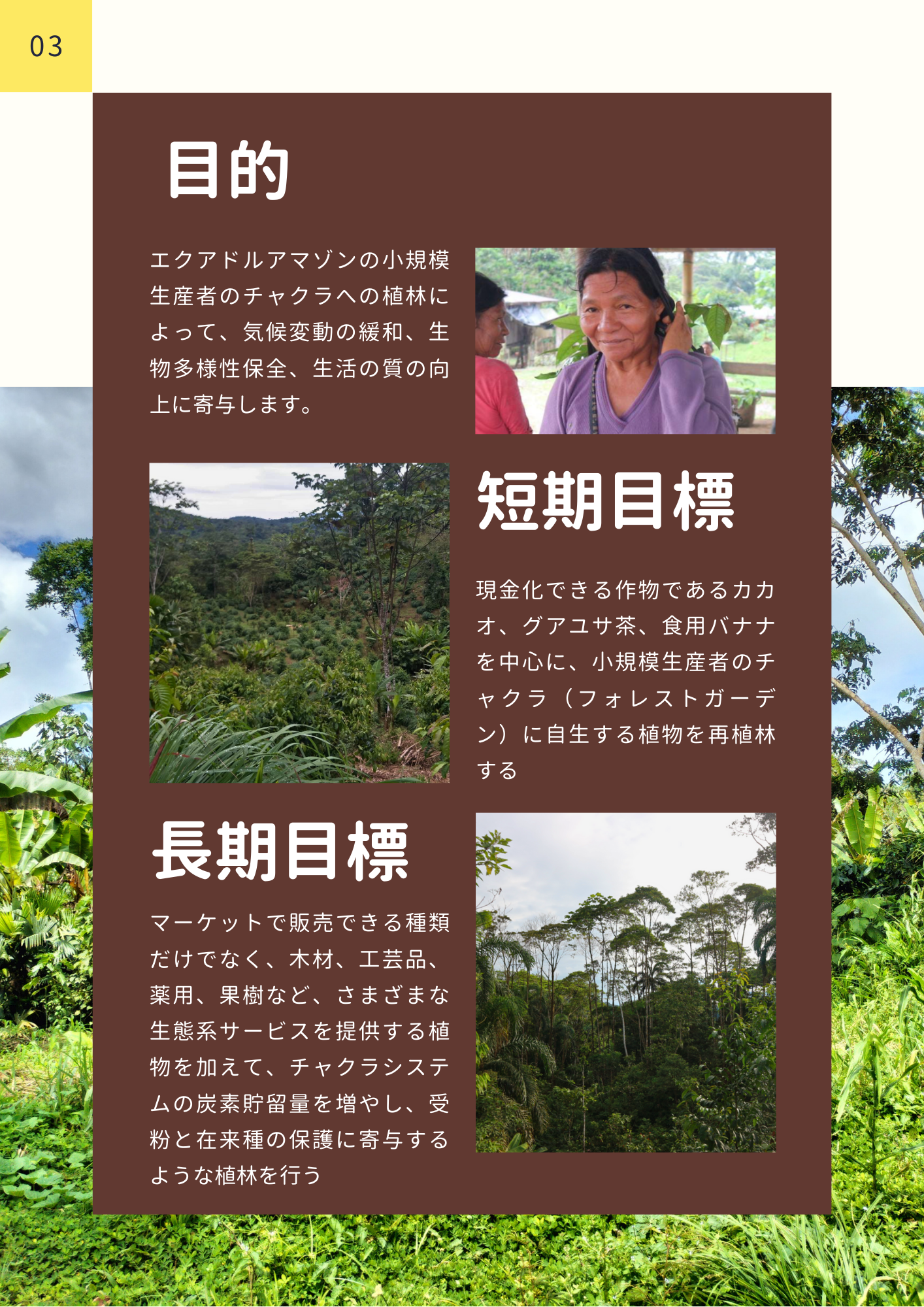 現金化できる作物であるカカオ、グアユサ茶、食用バナナを中心に、小規模生産者のチャクラ(フォレストガーデン)に自生する植物を再植林する