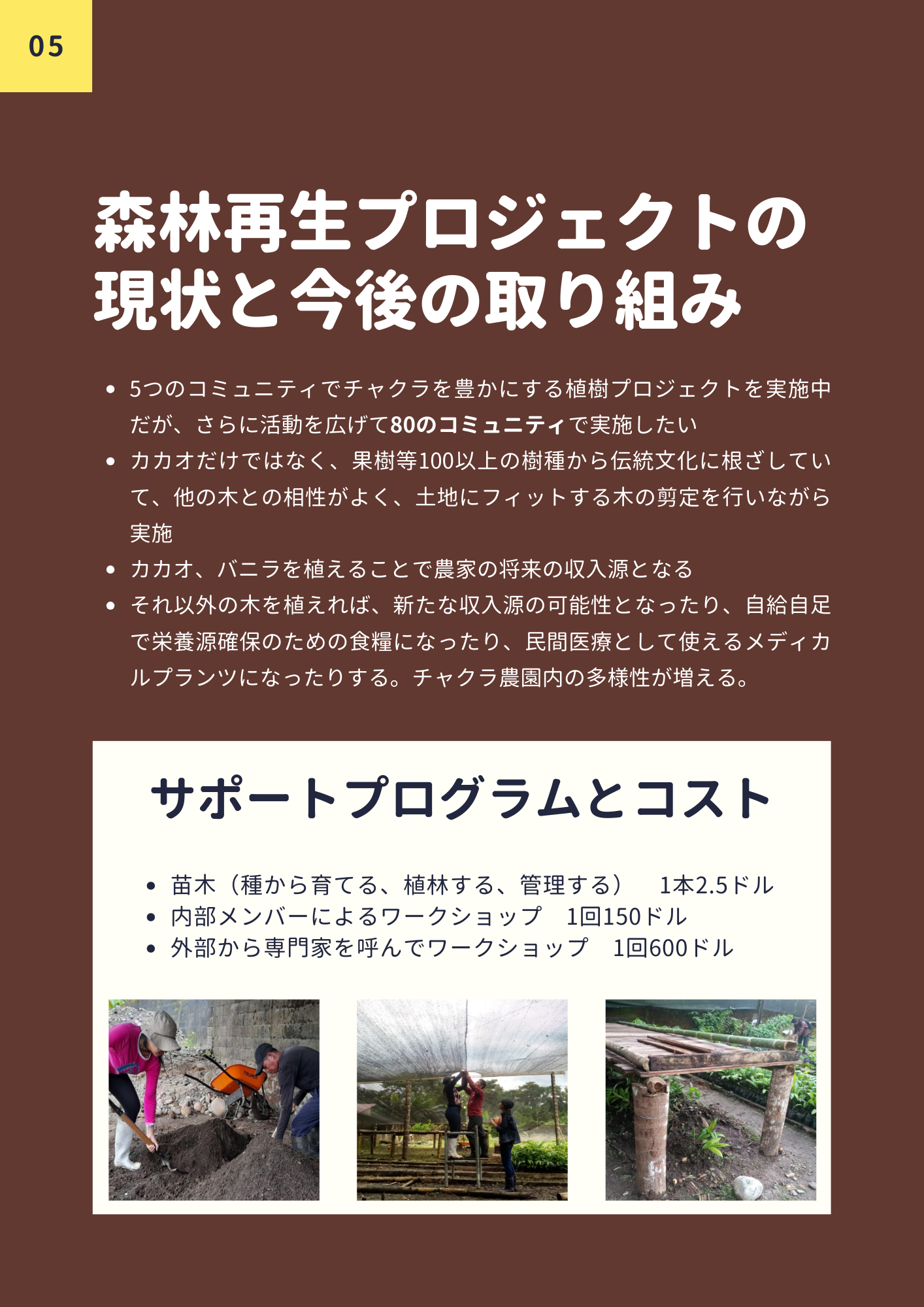・5つのコミュニティでチャクラを豊かにする植樹プロジェクトを実施中だが、さらに活動を広げて80のコミュニティで実施したい