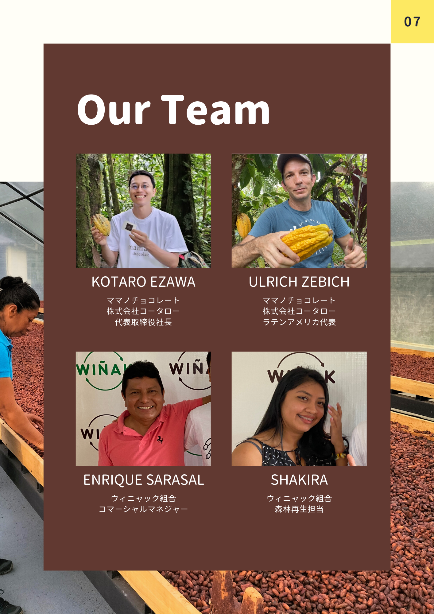 ママノが長年パートナーシップを結んでいるウィニャック組合では、カカオの栽培とともに、豊かな「チャクラ」を育むことで生物多様性への貢献を行っています。同時に、チャクラではユカ、キャッサバ、バナナ、とうもろこし、パームツリー、パイナップル、オレンジ、レモンといった食べ物を育てています。