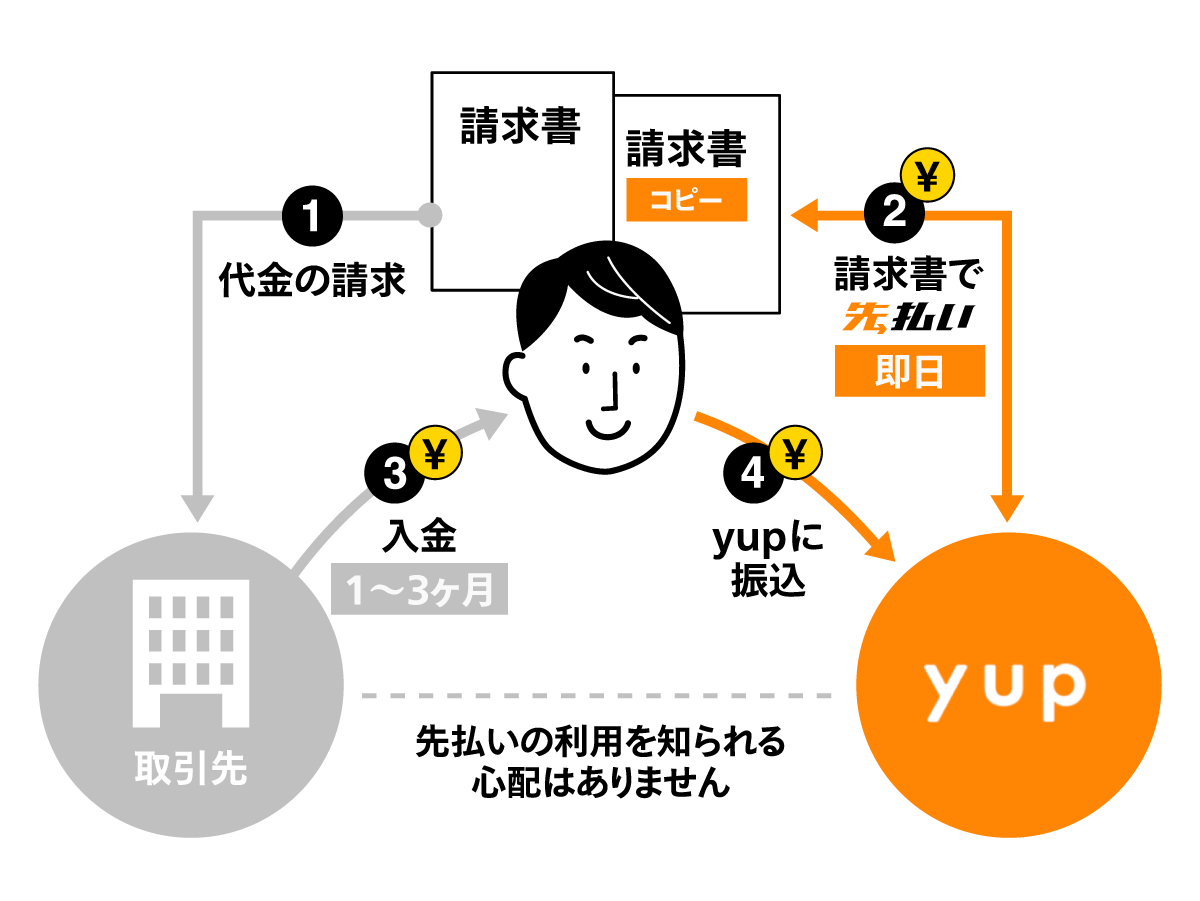 取引先に送った入金前の請求書情報をペイトナー(旧yup)に登録すると、報酬を即日受け取ることができるサービスです