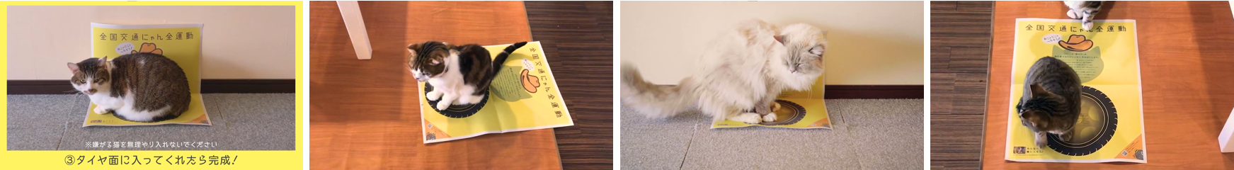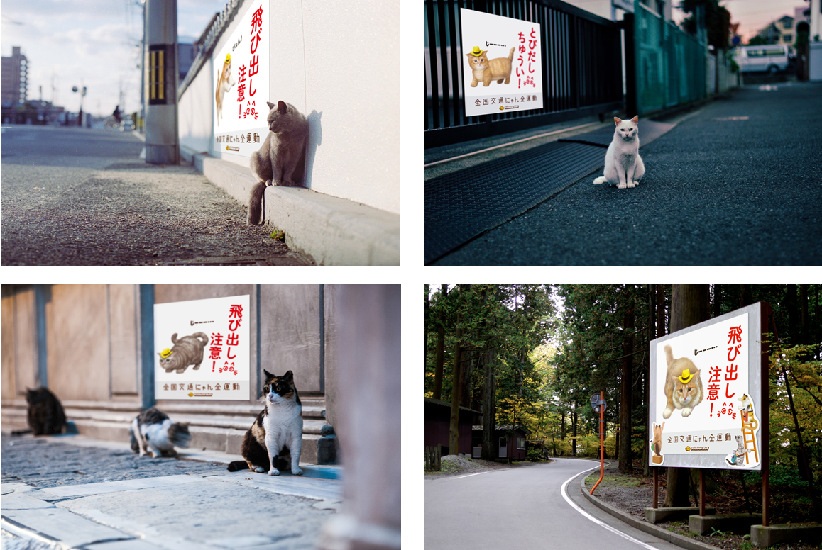 猫の習性に基づいたサイズ・形・色の「猫専用フォトスポット」を開発し、新聞の全面広告を展開。猫がその「猫専用フォトスポット」に移動することで完成する交通安全啓蒙ポスター。