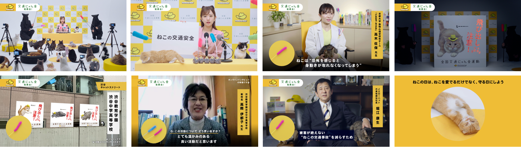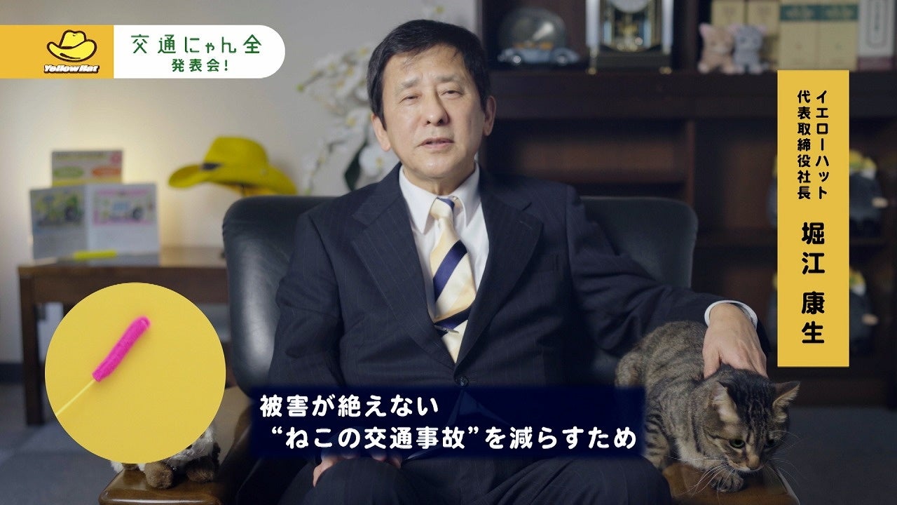 猫の日の2月22日(火)22時22分(予定)には、240秒もの長尺の「交通にゃん全発表会」をイエローハット公式YouTubeにて公開いたします。過去の活動や交通にゃん全運動に込めた想い、猫飛び出しサイン制作の裏側などを、猫も一緒に楽しめる記者会見風にしてお届けします。イエローハット代表の堀江自ら、人間だけでなく猫の事故を減らし、安心して暮らせるクルマ社会を目指すと、猫を撫でながら宣言します。