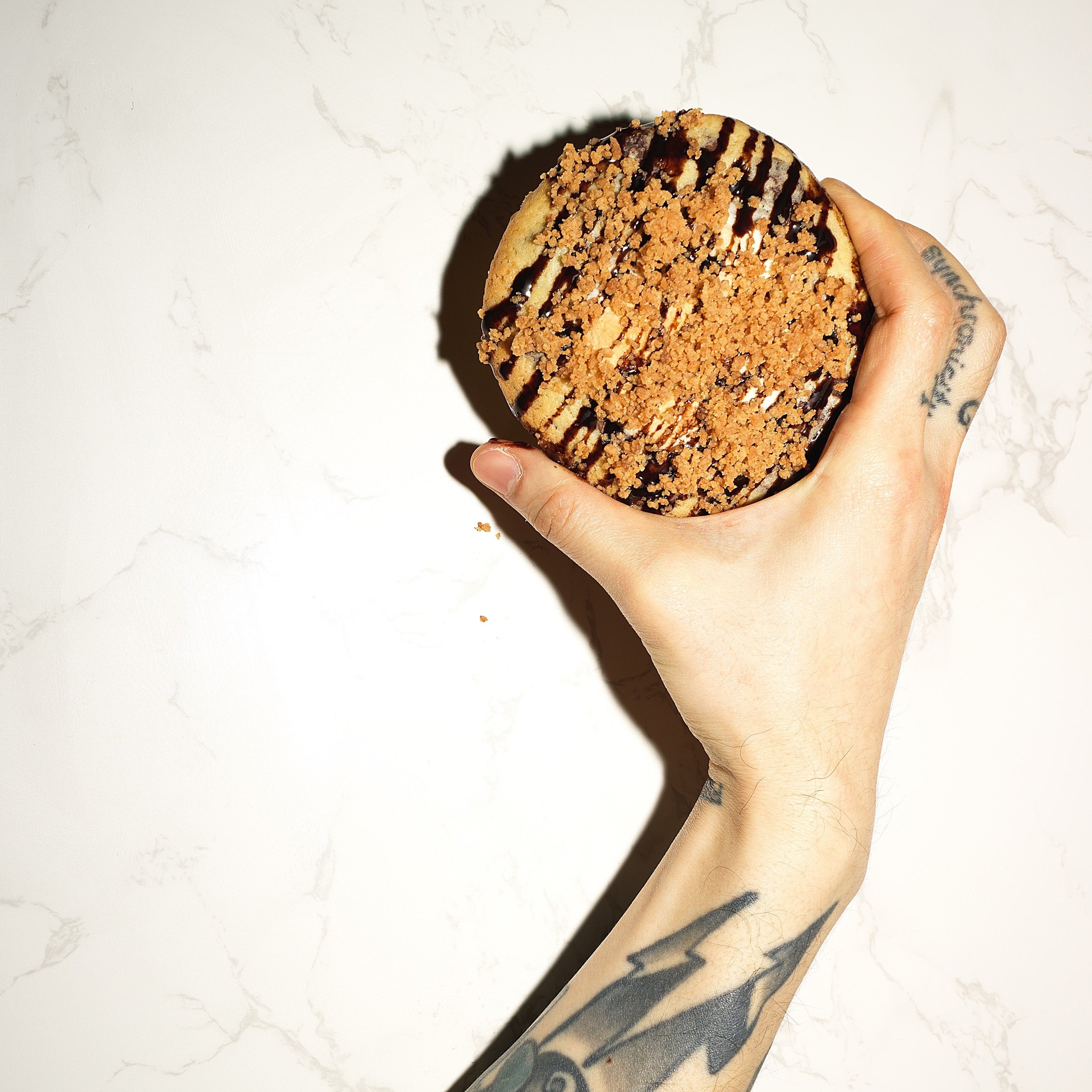 「エンターテイメント性の高いクッキーブランドを作ろう!」という発想からスタートし「であれば、なるべく身体に悪い素材の使用を避けたい。けどヘルシー系でありがちな煮え切らない味にせずパンチも欲しい」と思いこのスタイルのクッキーをRUMBLE CRUMBLEブランドとして作る事にしました。「見た目はボリュームがあって重そう」と思われる方が多いのも勿論察して「見た目とは裏腹な胃もたれしないクッキー!」になっております。