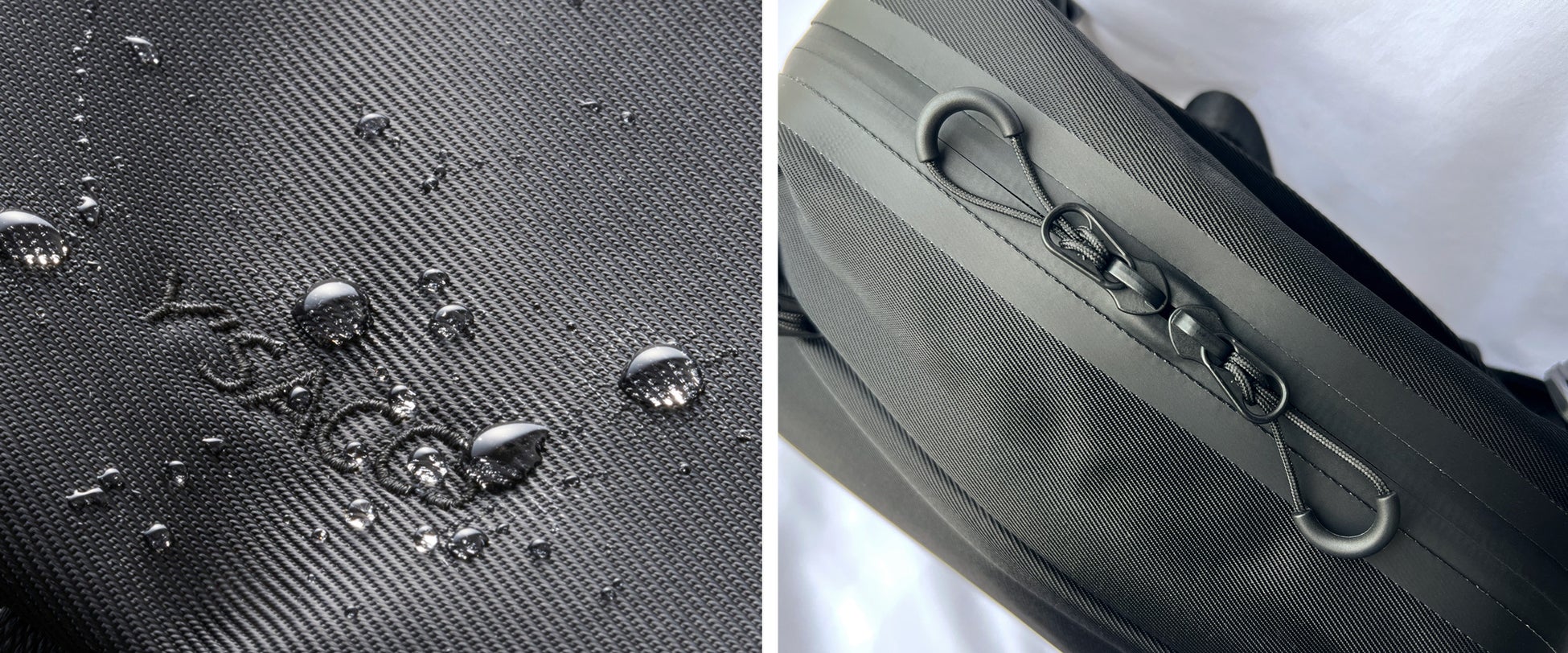 生地の表面には強撥水加工、裏面にはTPU加工を施し、撥水性・防水性をともに強化しています。