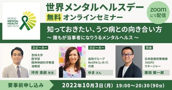 世界メンタルヘルスデー 無料オンラインセミナー「知っておきたい、うつ病との向き合い方」~誰もが当事者になりうるメンタルヘルス~開催日時: 10月3日(月)19:00~20:30