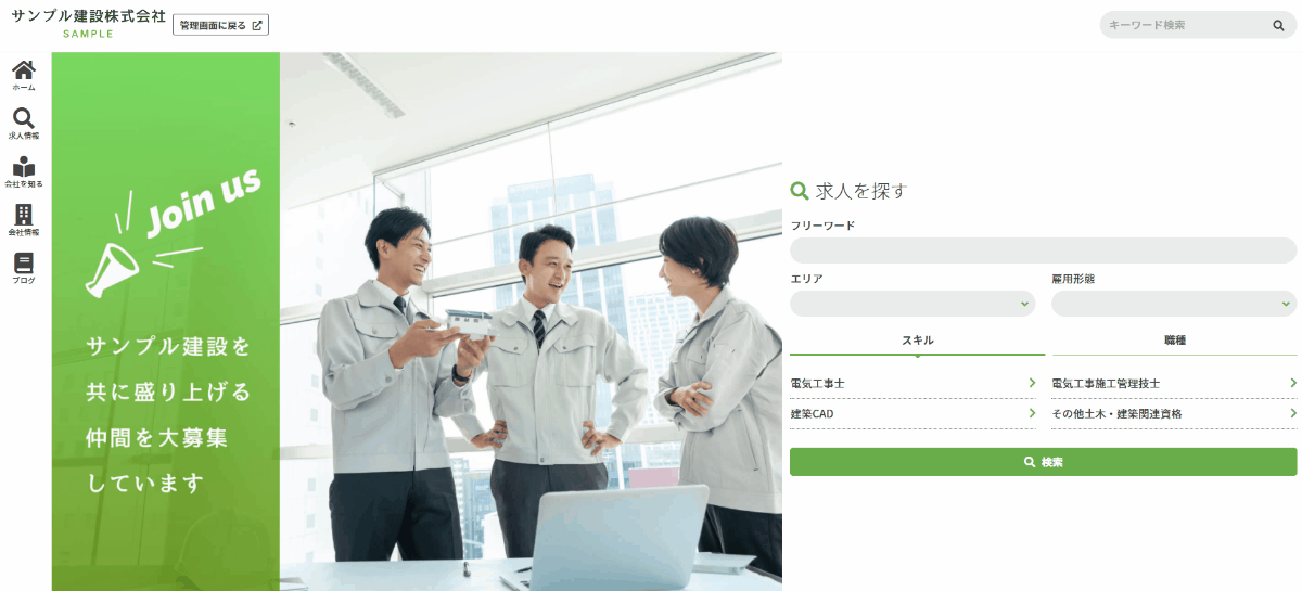 通常のサイト制作サービスと違い、建設業界に特化していることで使い勝手のよさを感じてもらえます。採用サイトでは専門的な業種やスキルの設定ができ、ホームページでは施工事例の作成も専用のフォーマットを用意しています。それぞれモノクラの各サービスのノウハウを踏襲しているため作成や管理が容易に行えます。