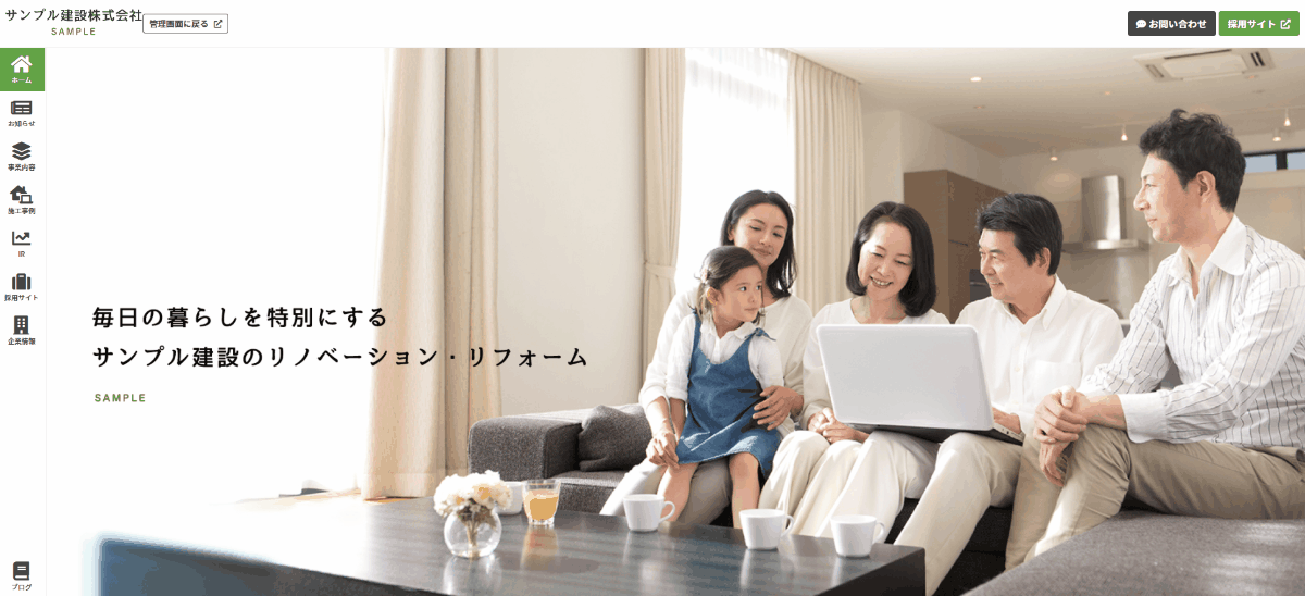 当サービスは、建設・建築業界特化のサイト作成SaaSサービスです。サイト作成の知識がなくても必要な情報を自分で管理画面で入力するだけで、企業に必要な様々なWebサイトを作成・更新することができます。月々の利用料も4,980円~と業界最安値であり、気軽に始めることができます。