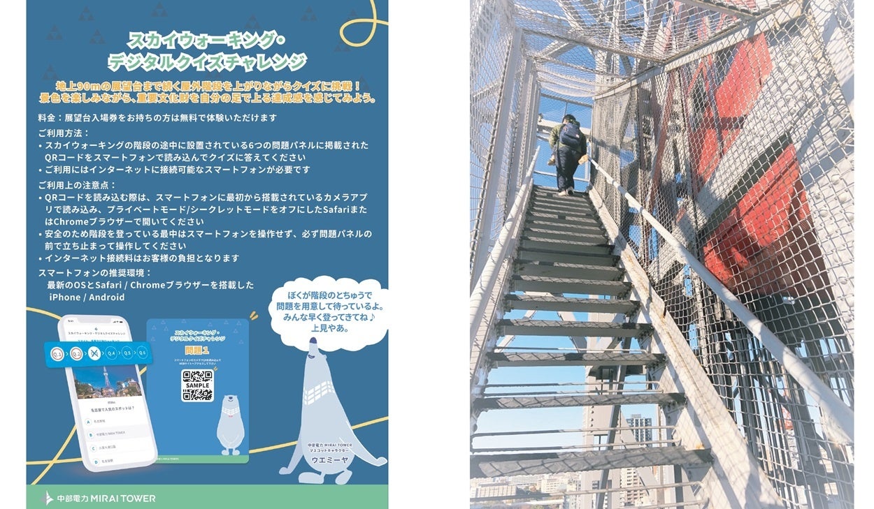 屋外階段の途中では、スマートフォンで楽しめる「スカイウォーキング・デジタルクイズチャレンジ」にご参加いただけます。楽しいクイズでミライタワーについて学びながら、運動不足解消や来場の想い出づくりにもおすすめ!展望台とご一緒に、ぜひお楽しみください。