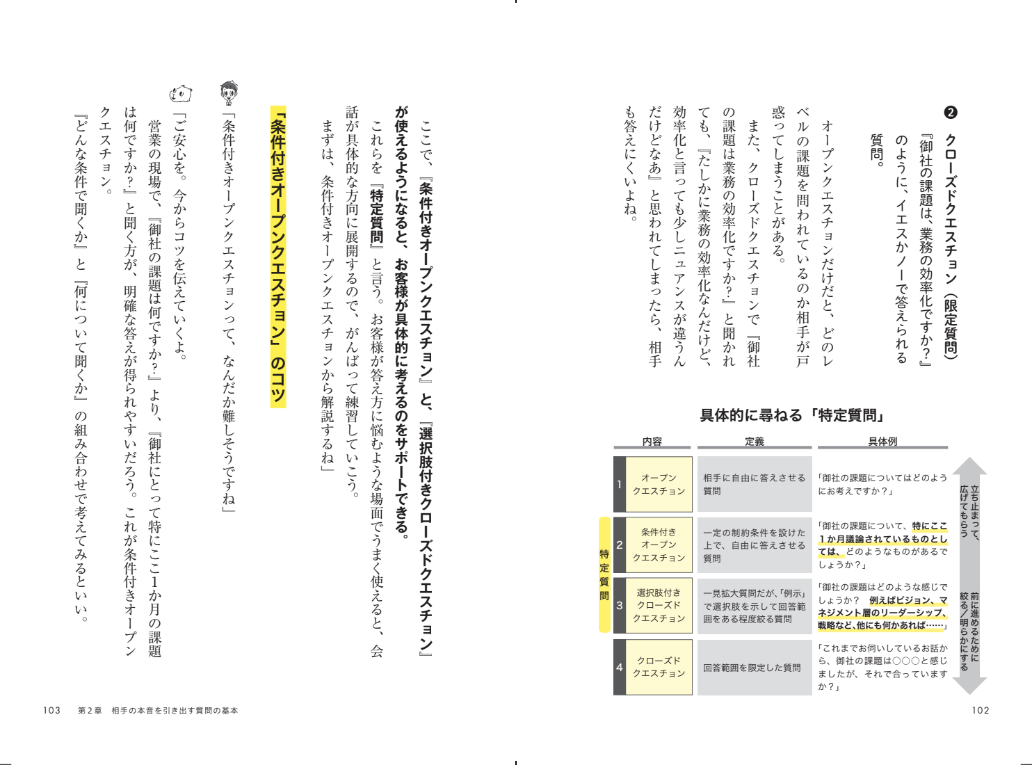 第2章:「質問力」の基本的な技法をマスターする では、「枕詞」「深掘り質問」「特定質問」という3つについて、具体的な言い回しと商談のトーク事例を載せています。