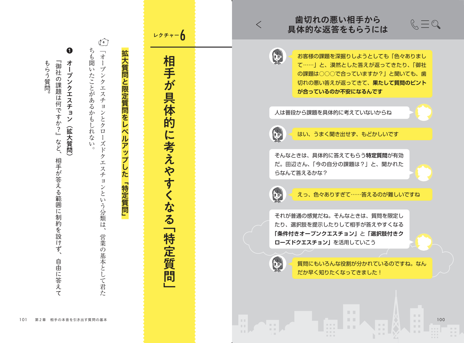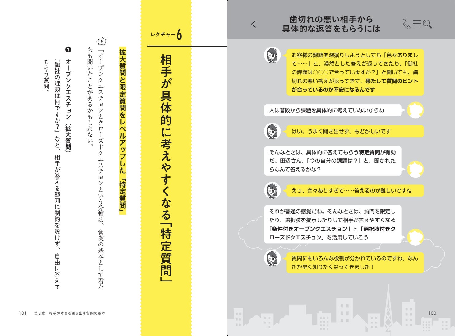 第5章:質問力を活かして案件を増やす では、キーパーソンとのアポイントを設定する、「今はまだタイミングではない」お客様の意欲を引き上げるといった高難易度の場面への対応策を書いています。