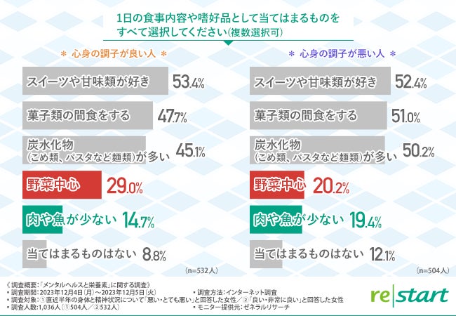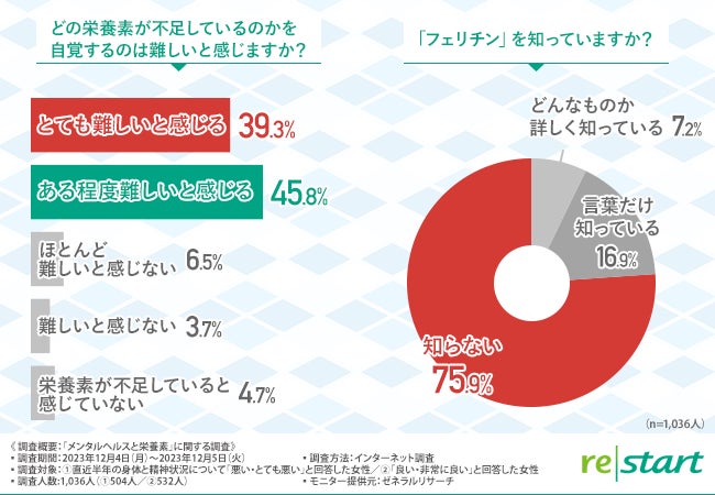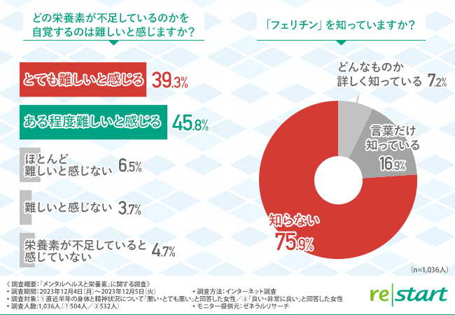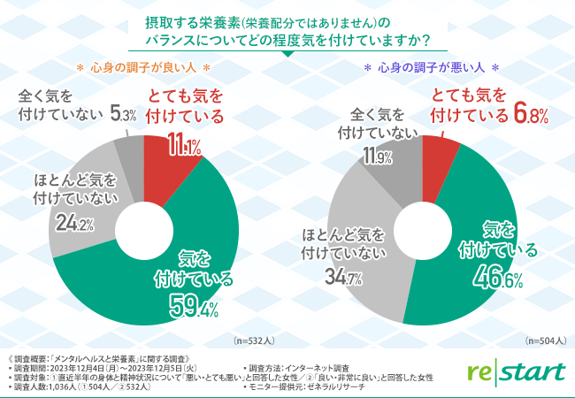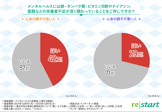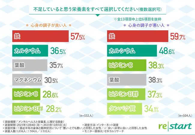 そこで今回、フェリチン検査サービスや分子栄養医学ヘルスケアサービスを提供するリ・スタート株式会社(http://www.re-start.co.jp/)は、直近半年の身体と精神状況について「悪い・とても悪い」と回答した女性504名/「良い・非常に良い」と回答した女性532名を対象に「メンタルヘルスと栄養素」に関する調査を実施しました。
