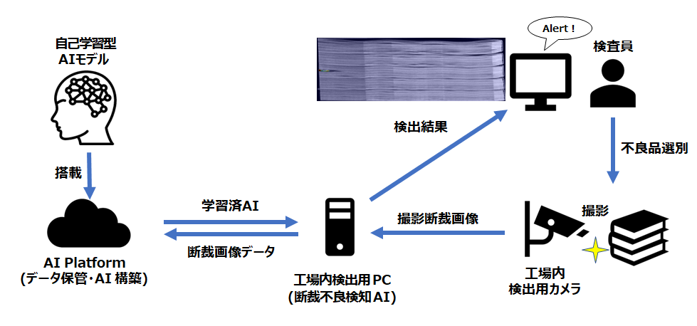 図書印刷では、「製造DX」推進の一環として書籍における外観検査業務の自動化による少人・省力化、スキルレス化を目指しており、製本機械メーカーとして永年、検査機の開発・販売・保守に携わってきた芳野YMマシナリーの豊富なノウハウをベースに、検査判定部に当社が新規開発した※1自己学習型AIを採用した外観検査システムの実証実験を開始します。