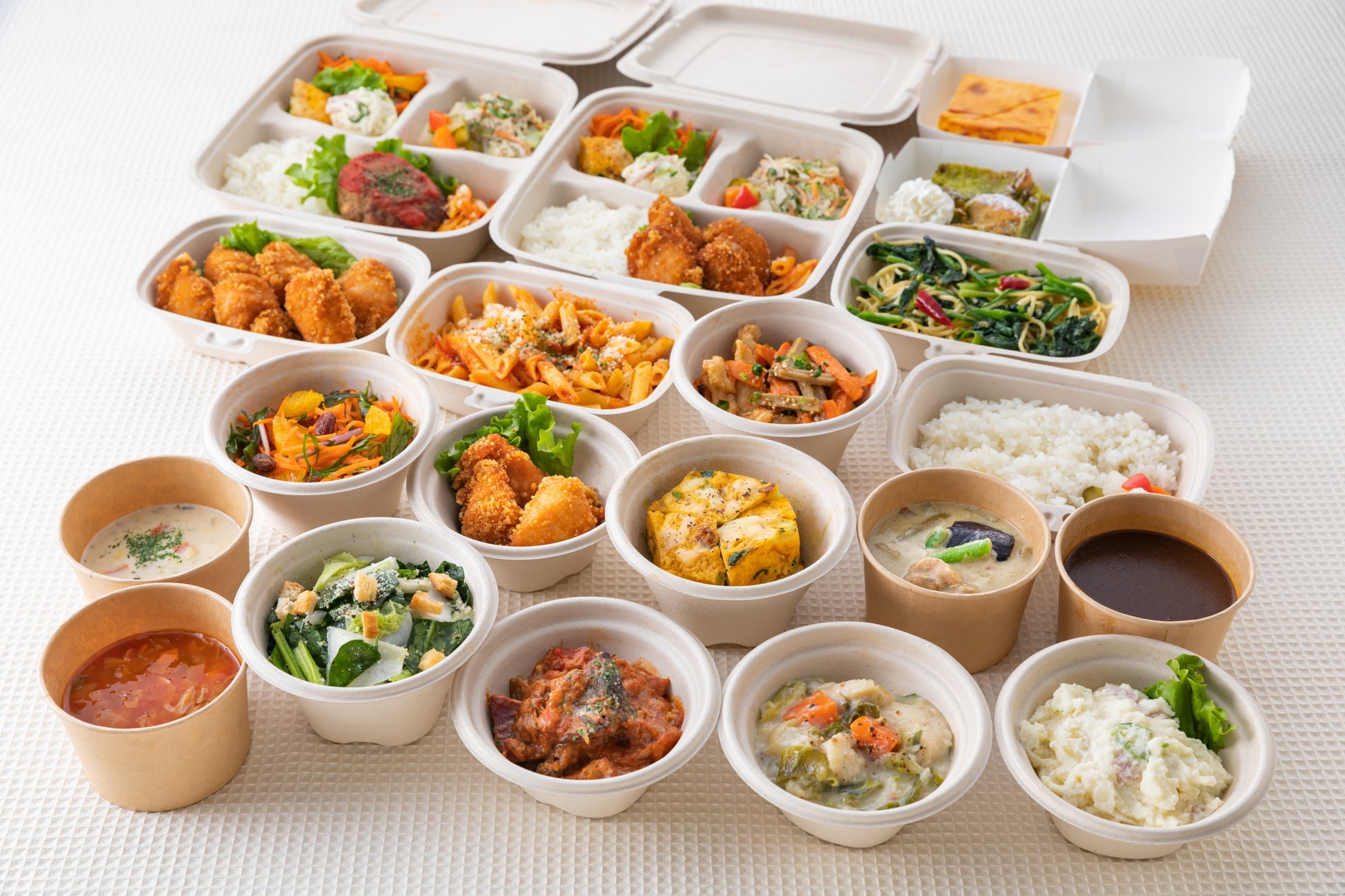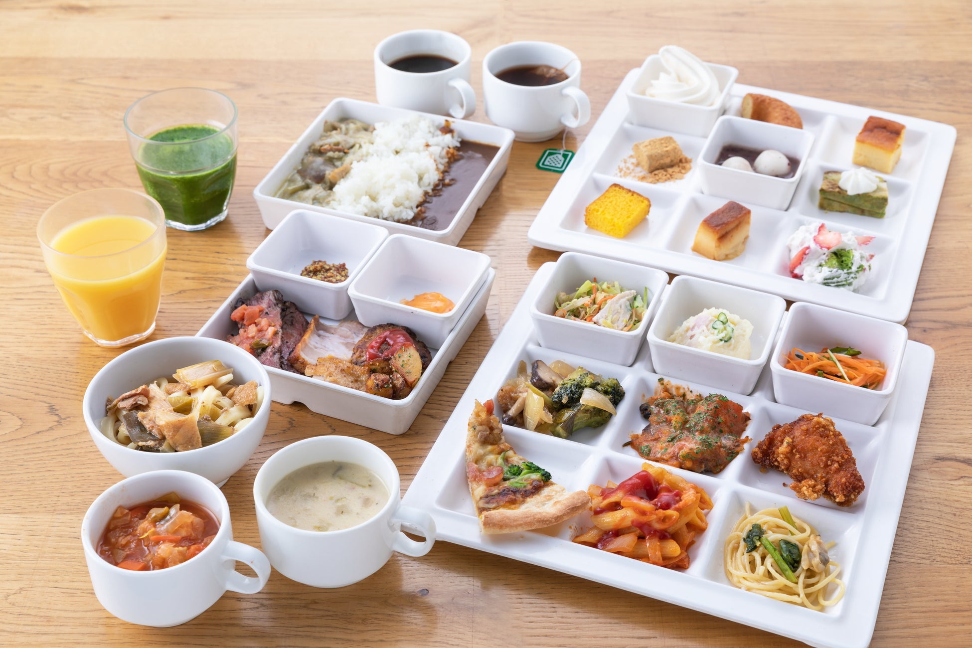 6) 「テイクアウト・デリバリー専用カウンター」を設置し、ビュッフェの人気メニューを盛り合わせた弁当・パーティBOXやDELI(惣菜/スイーツ)など「おうちご飯」としてもご利用いただけます。容器は、SDGs目標14「海の豊かさを守ろう」を推進する「使い捨てECO容器」(サトウキビの絞りカスや再生紙を使用)でご用意いたします。