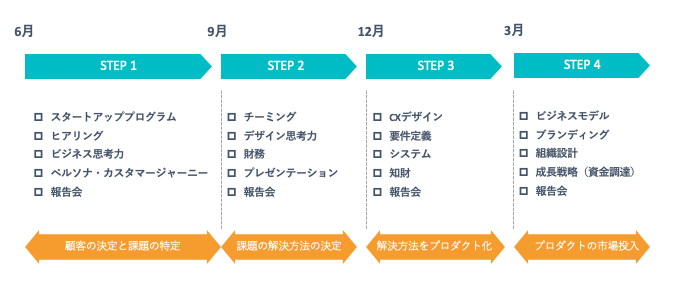 12ヶ月間のプログラムの中で、アプリを用いながら、2週毎のワークショップとメンタリングを通じ、新規事業を創り出すことをサポートします。