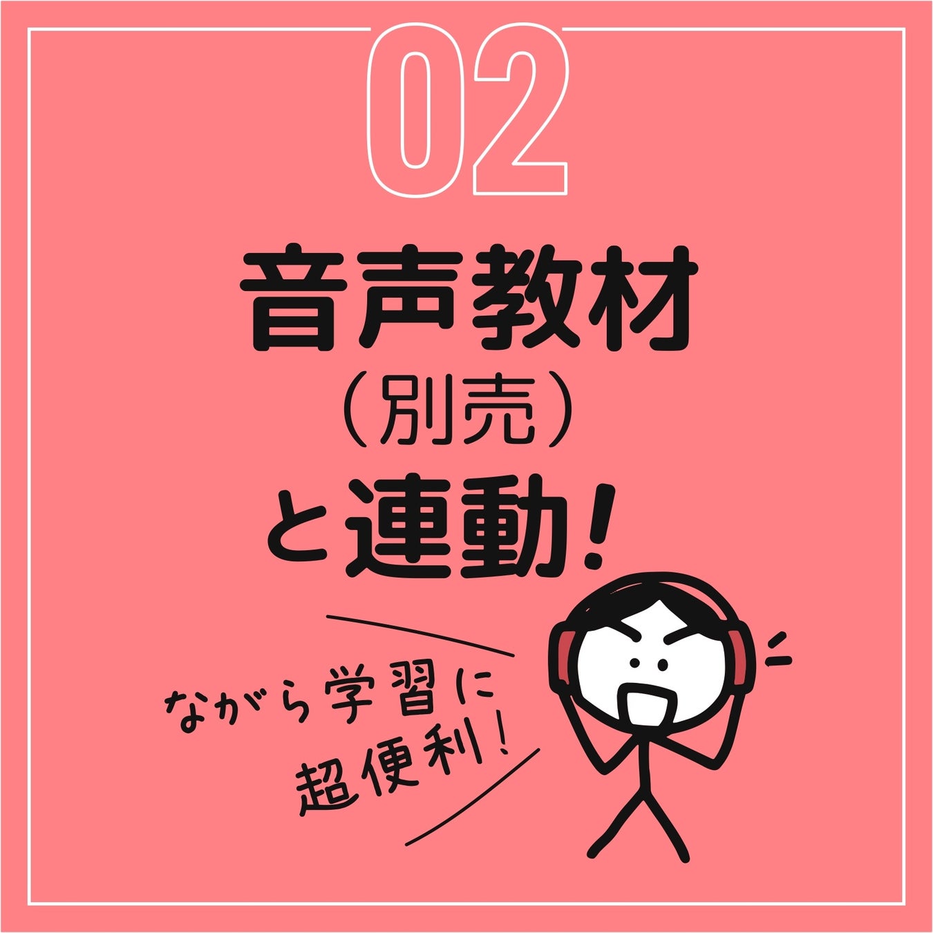 本書のテキスト部分をナレーターが読み上げた、別売りの音声教材も販売しています(※1)。音声教材を併用すれば、移動中や運動中、家事の最中などでも「ながら学習」ができ、忙しい方でも時間を有効に活用して学習することができます。