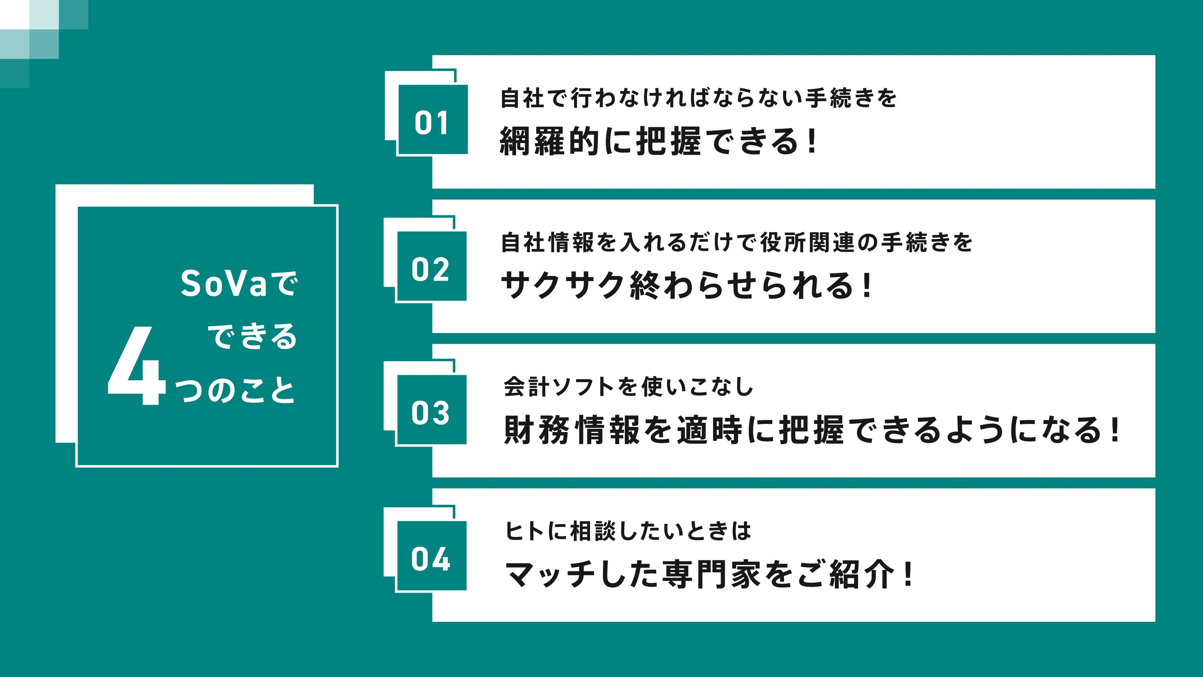 SoVaを使えば、自社で行わなければならない手続きを網羅的に把握できます。