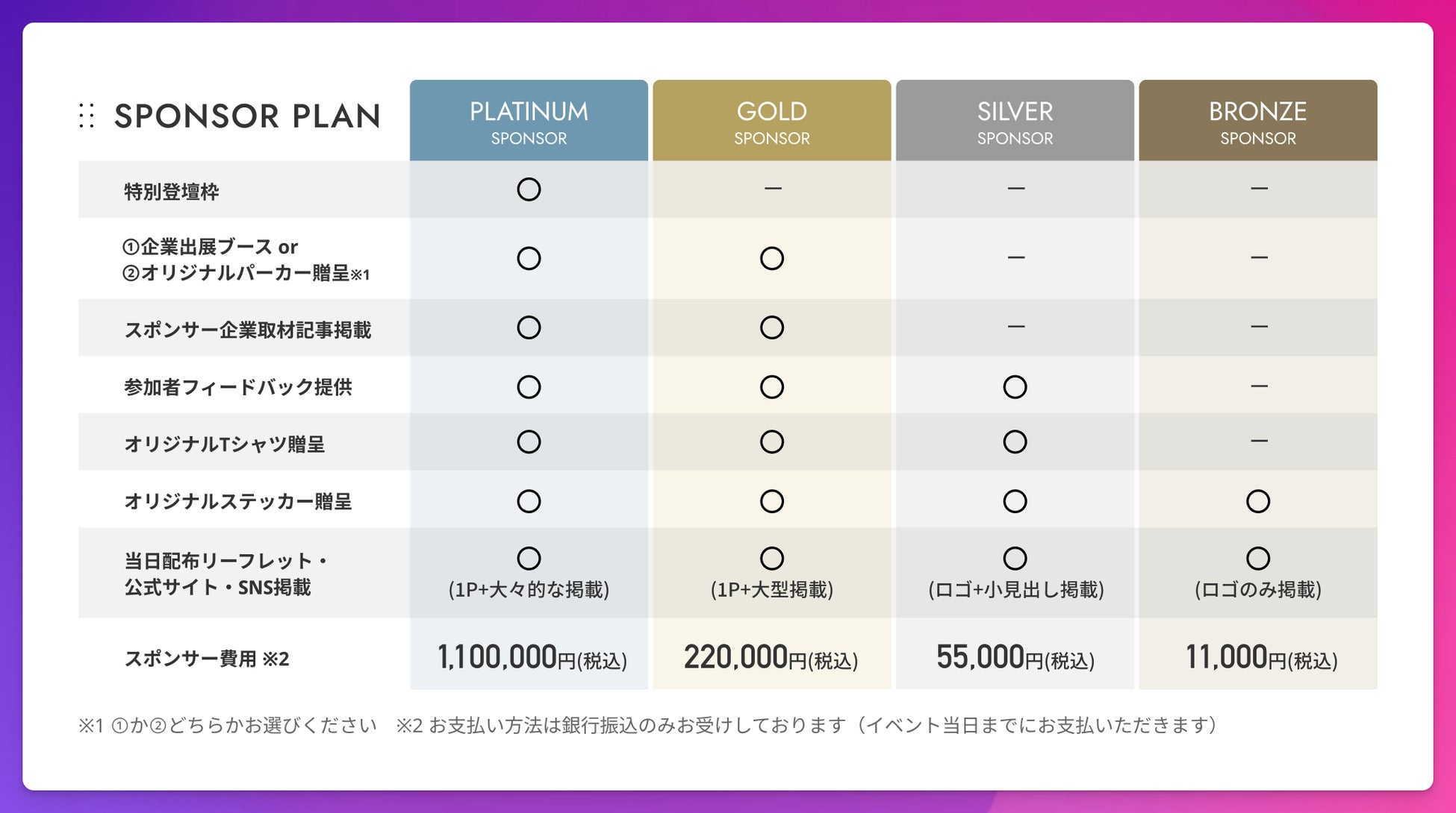 当イベントはすべての方が等しく参加でき、開かれたコミュニティとして運営していきたいという想いがあるため、イベントの運営はすべてスポンサーのみで行っております。我々の思いにご賛同、ご協力いただけるスポンサーを広く募集しております。
