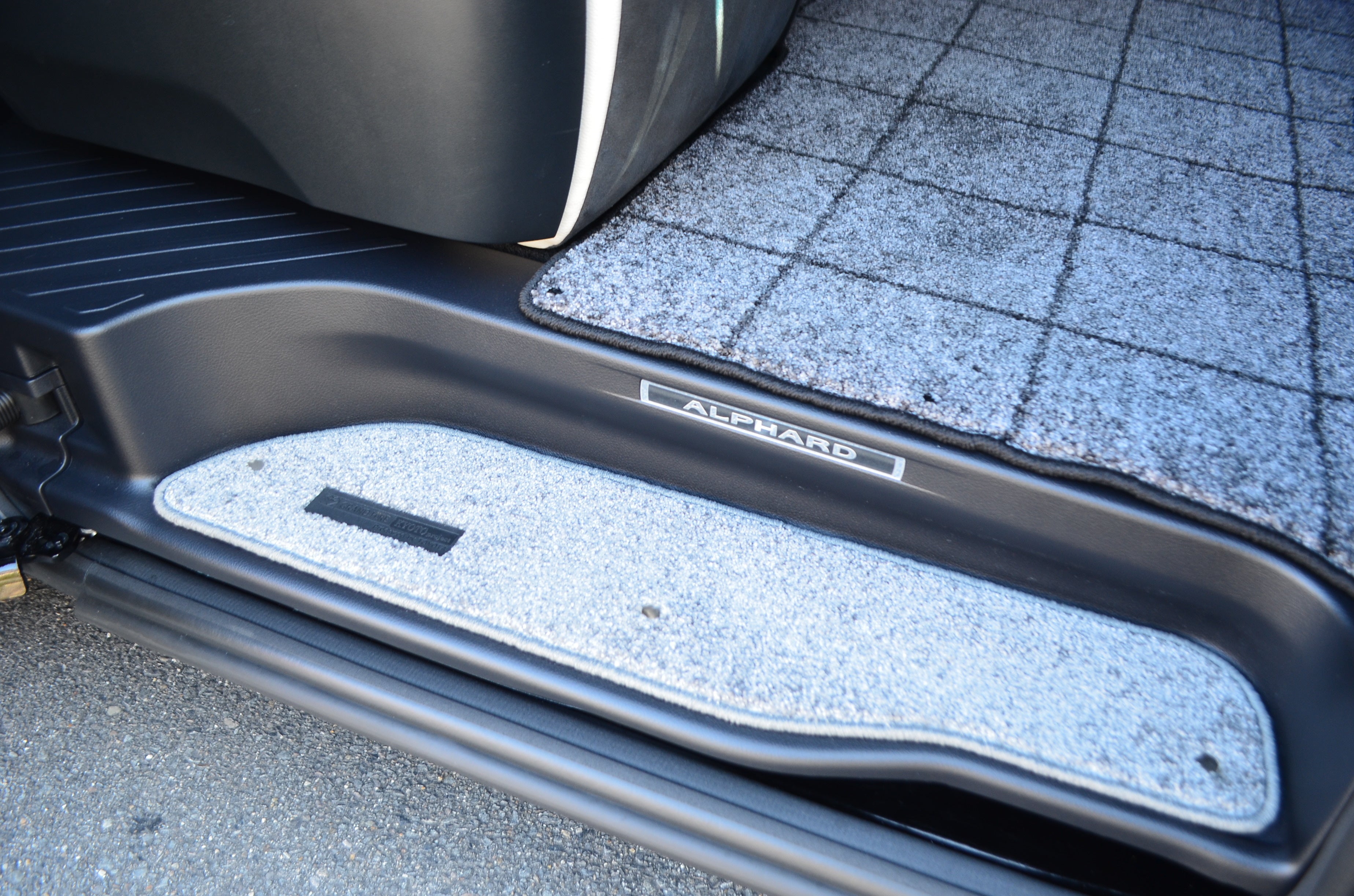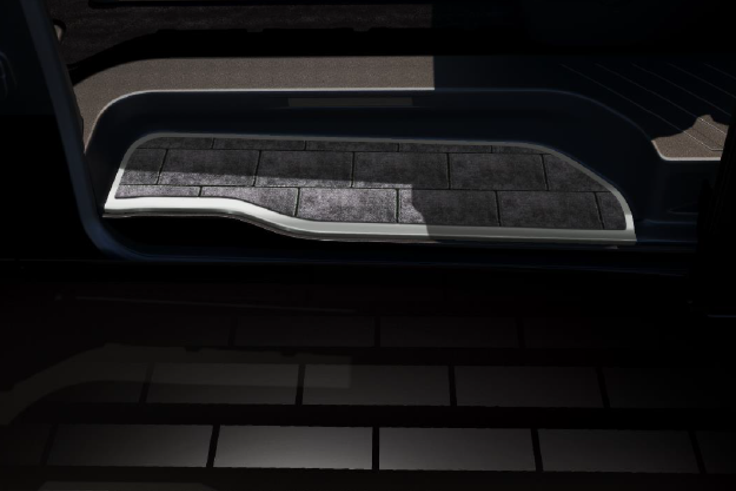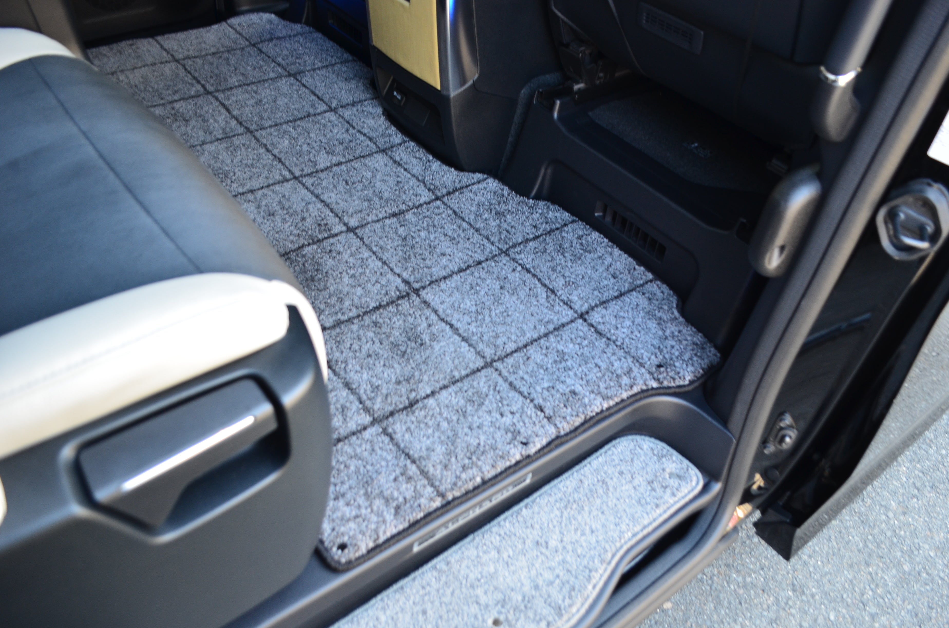 和風建築の沓脱石を意識し、まず車内に乗り込む際のスライドドアステップには御影石モチーフとした石畳エントランスマットを、フロアには玄武岩をモチーフとした石畳フロアマットを敷き、まずは足元から違いを楽しんでいただきます。