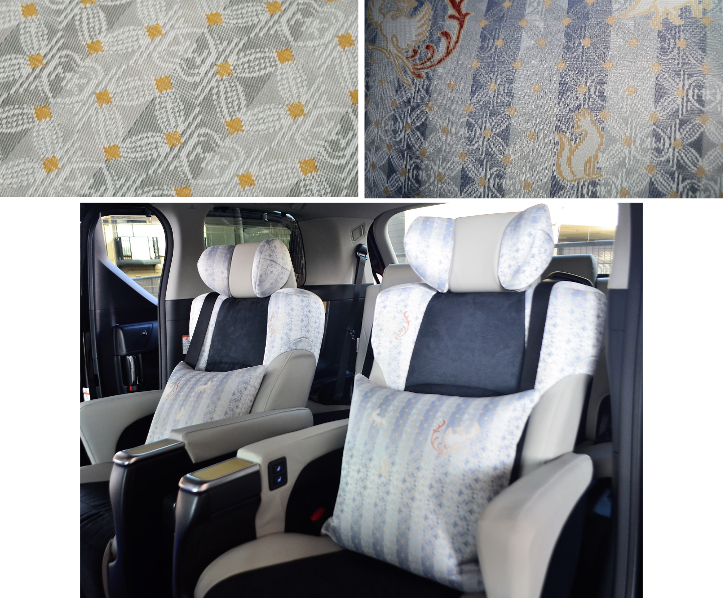 西陣織でこの度、特別に製作されたシートカバーにはMKタクシーのロゴマークと七宝模様のモノグラムに京都を意識した狐や鳳凰があしらわれており、シートだけを見ても老若男女、国内外問わずに楽しんでいただけるように意識いたしました。とくに七宝模様とは円形を4つ重ねた連続模様で、その中にMKのロゴを入れることで「MKから輪が広がるように」という意味を込めてトヨタデザイナーとフクオカ機業にて制作された模様です。また、SDGsの観点から再生PETの糸を使用し、若手職人が拘って織りあげました。