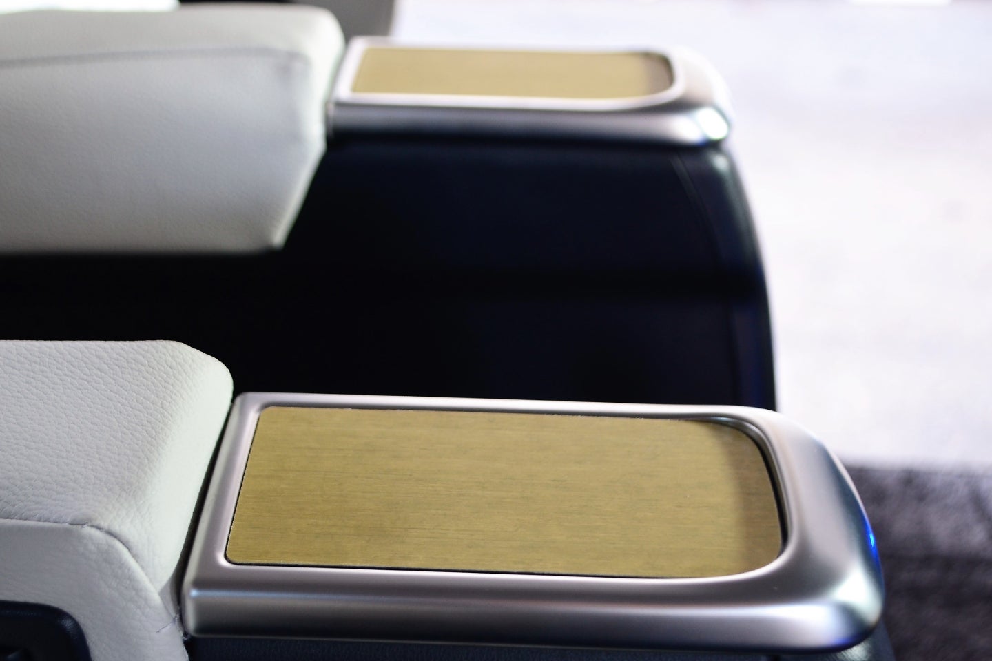 着席後、肘掛け部分の手元などには竹を使った「和竹加飾パネル」が施されており、肌触りでも京都を感じることができる車内といたしました。