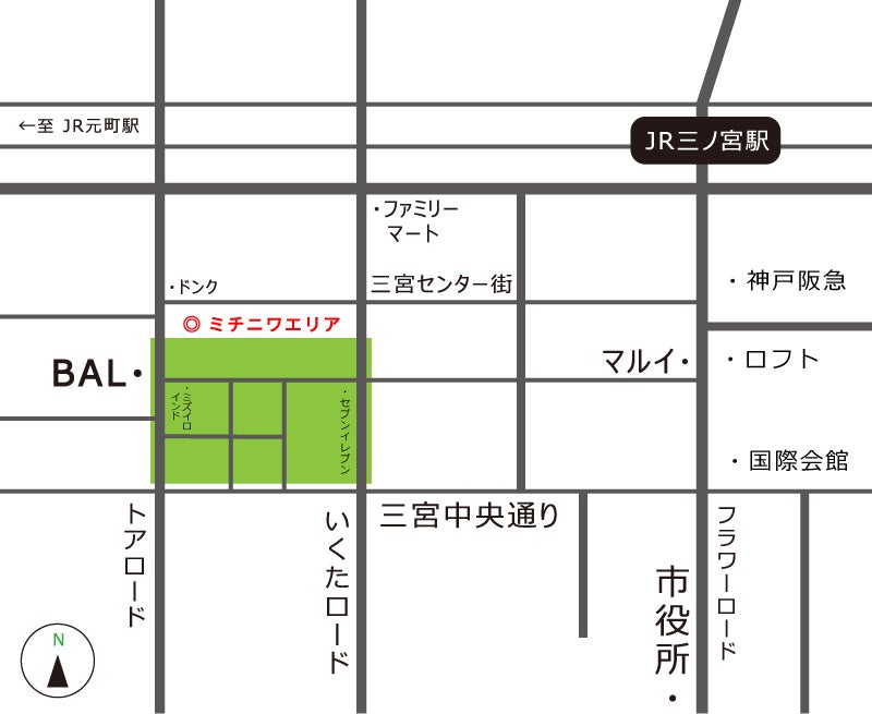 三宮・元町駅のちょうど中間。歩いて5分のこの場所 「ミチニワ」は、センター街の南側にのびる「三宮本通商店街」と「センターサウス」一帯をまるっと示す名称です。 およそ 150年前まで、この界隈は大きな森がありました。 街道に面し、航海の安全や商工業の繁栄を守る三宮神社の 境内だったこの界隈は、泉が湧き緑に包まれた、だれも が思い思いに過ごせる心地いい場所でした。そこに自 然に人々が集まり、賑わいが生まれ、この街は少しずつ 歩み始めたのでした。その場所のあたらしい姿を今こ そ。そしてもっとたくさんの方々に。