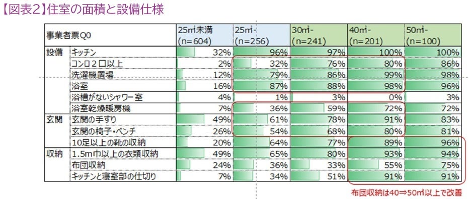 1.自立した高齢者の生活には、洗濯機・衣類収納、キッチン(コンロ2口以上)、充実した玄関、食寝分離が望まれる。これらを確保するには40㎡以上の面積が一つの目安となる。冬用の寝具やブーツなどの収納が不足すると自宅売却にあたっての家財整理が障害となる可能性がある。