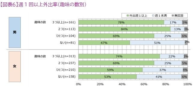 4.共用部に多目的ホールがあると、趣味・サークル活動が行われ、住宅内外の交流頻度が高まる。趣味活動の充実は外出を促進し、外出と交流の増加はウェルビーイングの向上につながることが期待される。