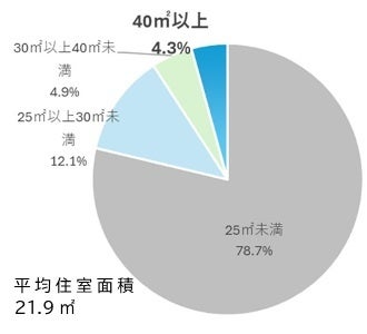 ・サービス付き高齢者向け住宅は、全国で約29万戸(290,444戸、令和7年8月末)供給されているが、その78.7%は住室面積が25㎡に満たないもので、住室面積40㎡以上住戸は、全体の4.3%(12,397戸)のみである。