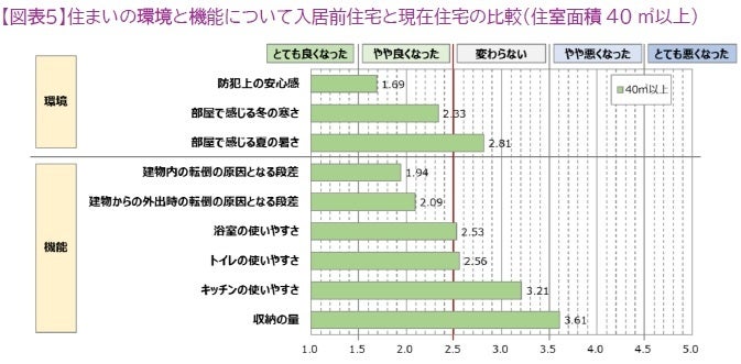 3.40㎡以上の住宅に居住する入居者について、入居前住宅との比較では、防犯上の安心感、寒さ解消、転倒防止で高い評価が得られている。一方、キッチンの使いやすさと収納の量については改善の余地があることが示された。