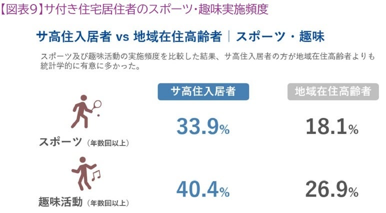趣味やスポーツ活動に月1回以上参加する入居者は、要介護リスク・フレイルリスクが低く、健康寿命の延伸につながる可能性が示唆されています。
