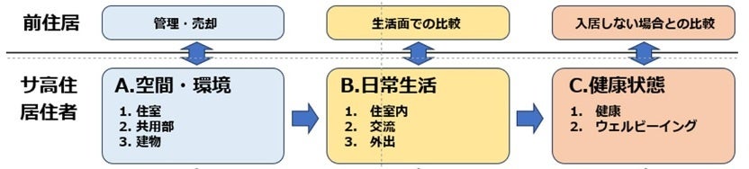 ・調査目的:サ付き住宅に早めに住み替えた自立高齢者を対象に、【A.空間・環境】、【B.日常生活】、【C.健康状態】の関係を明確にする。