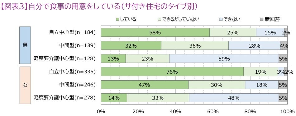 2.自立した高齢者は、住宅の共用食堂があっても、全ての食事を食堂に頼るのではなく、部分的でも自分で調理をしている。自分で食事の用意をする人は必要な食材を買うために外出していることも把握された。外出が促進されることは、ウェルビーイングを高めることが期待される。