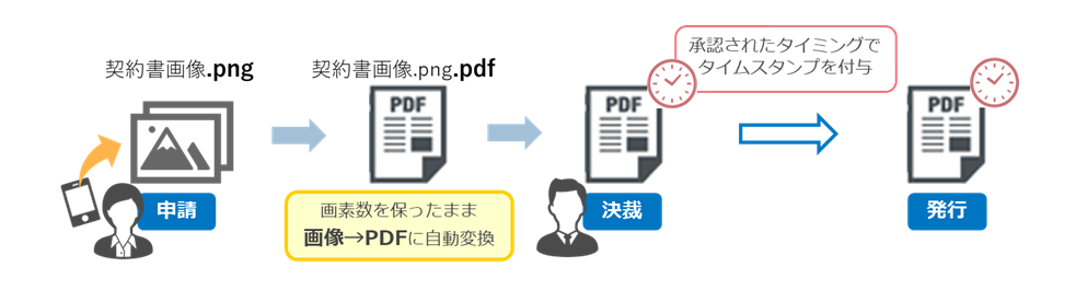 これにより、領収書などをスキャンするためにわざわざ出社することや、スマホで撮影した画像をPDFに変換する必要が無くなり、外出先や在宅勤務中にスマホなどで素早く簡単に書類を登録することが可能になります。スマートデバイスの利便性が向上したことで、今までの文書登録や申請業務をさらにスマート化できるようになります。