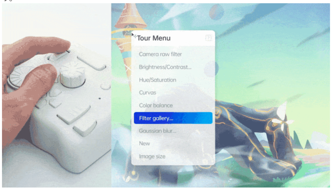 『TourBox』には「Tourメニュー」という各種操作メニューを独自のメニューに登録して使える機能が用意されております。簡単に説明すると、右クリックメニューを好きなように作るようなものです。各ソフトの操作命令をユーザー自身の好みに合わせて配置できるので、頻繁に利用するものを並べておけば、操作が快適になります。