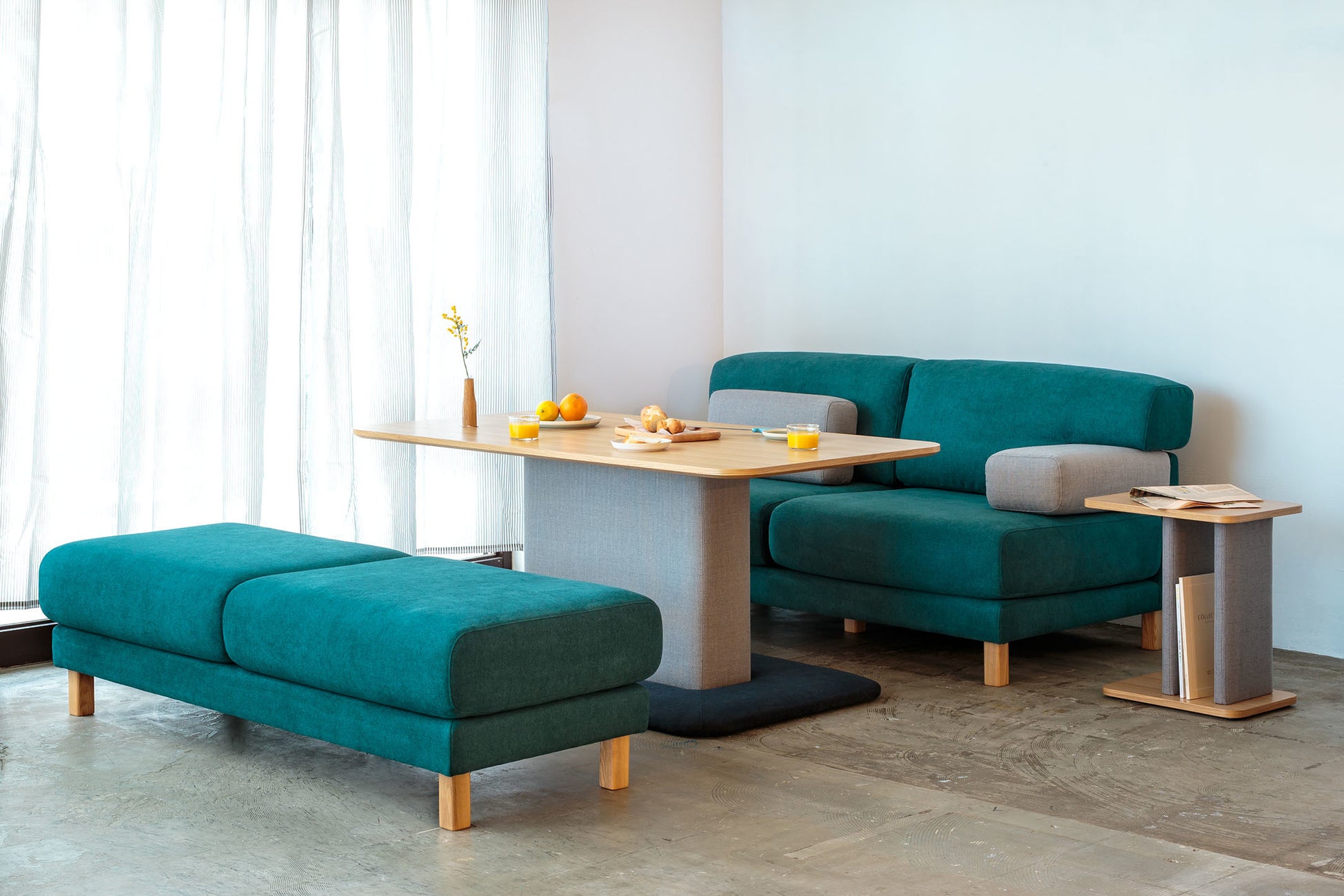 丸みのある非対称のフォルムは愛嬌があり、身体にも空間にも優しい印象を与えます。アームレス側は椅子の背もたれのような角度が斜めに入り、横からも背中を預けることが出来ます。オットマンを加えるとカウチ的な使い方もでき、横にも縦にも奥行きが広がります。使い方のバリエーションが豊富で、コンパクトながら機能的に使えるソファです。