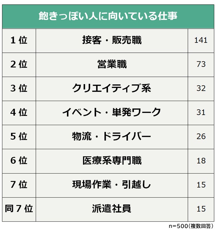 - 飽きっぽい人に向いている仕事1位は「接客・販売職」