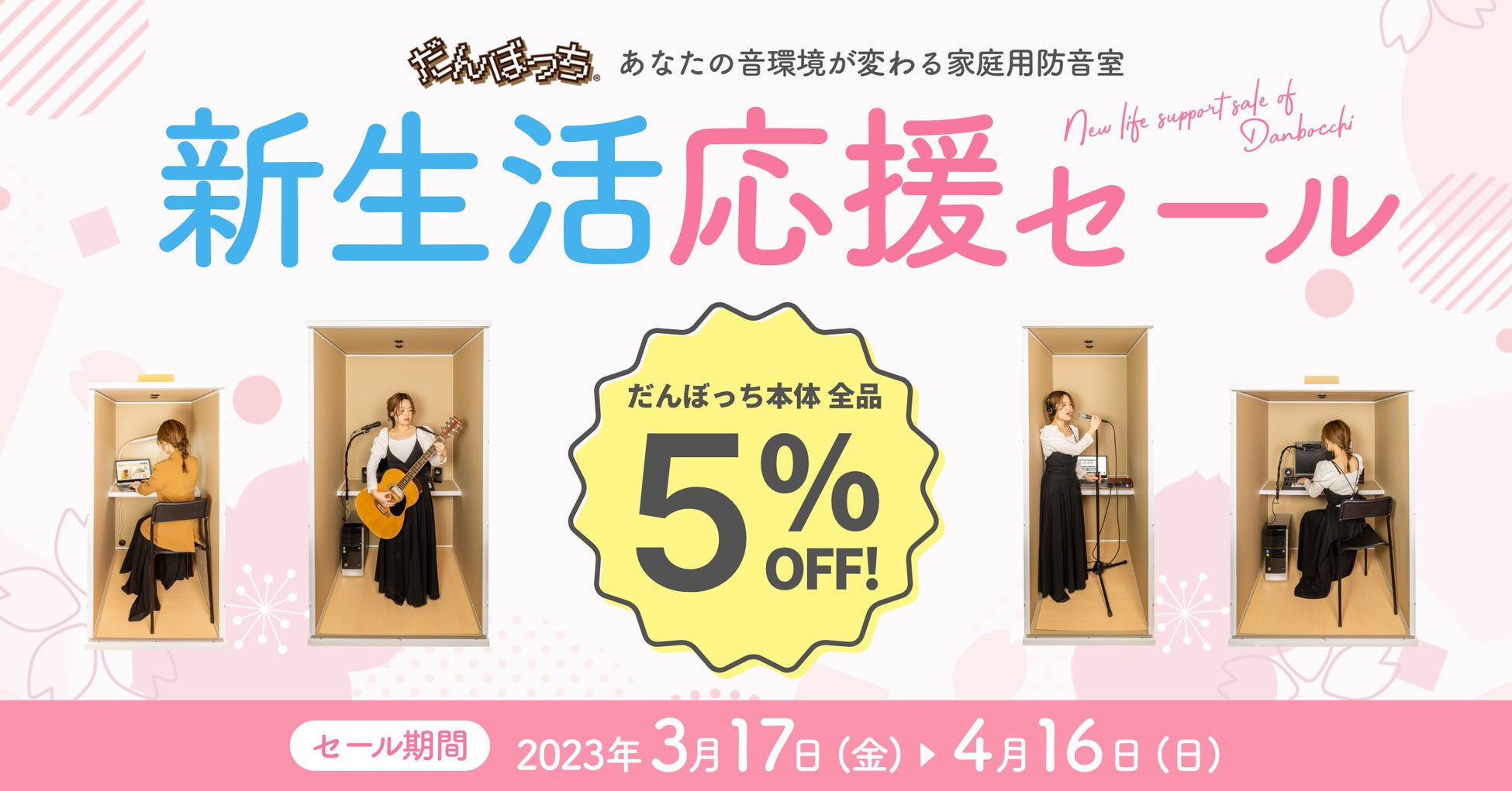この度、簡易防音室「だんぼっち」が新生活応援セールを開催します。期間は2023年3月17日(金)から4月16日(日)までの約1カ月間。シリーズ4製品すべてを5%OFFで販売します(※オプション商品は対象外)。