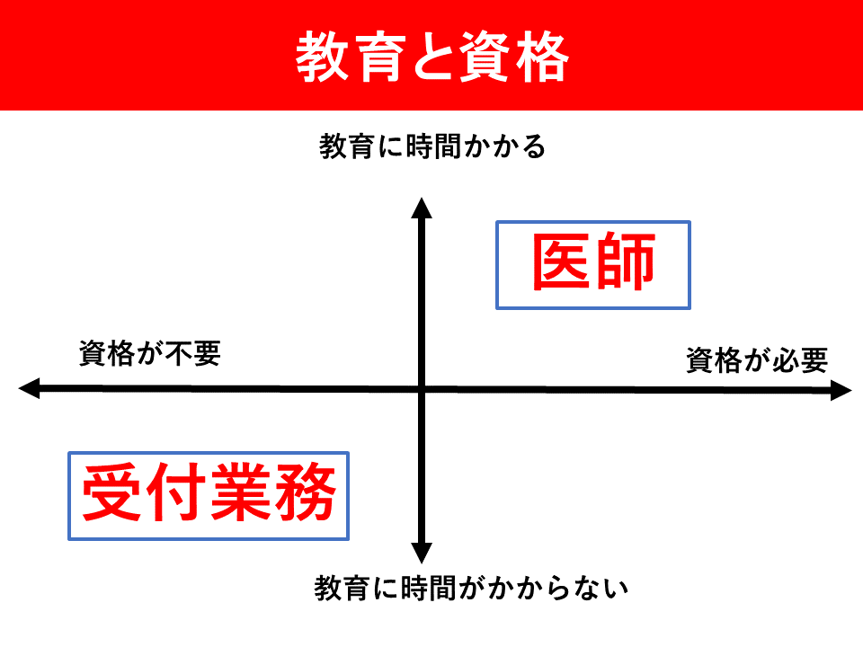 受付スタッフは医師よりも貴重!というと 皆さん「???」となると思います。 貴重の定義によって異なると思いますが、一般の方々のイメージとしては下図のようになります。そうなると医師の方が貴重では?と思われるかと思います。