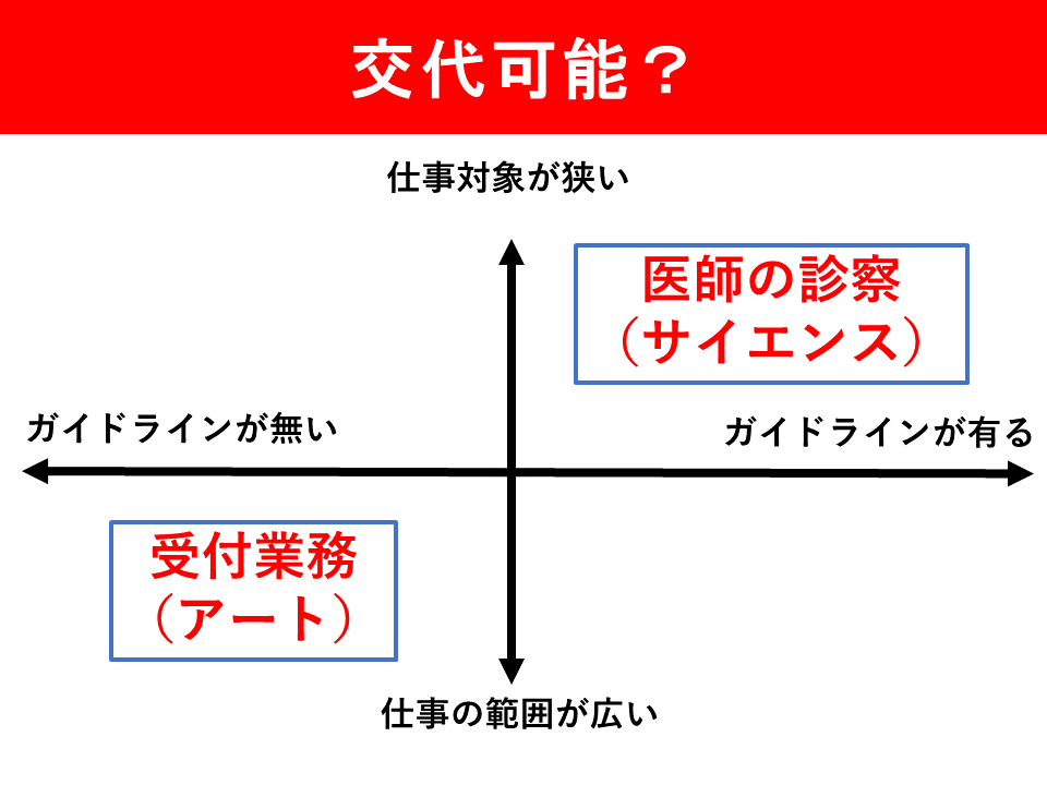 クリニックに行かれたときに代診の日があると思います。だからといって大きく診察内容が変わることは無いと思います。それは医療機関における検査・診察は論文・ガイドラインで言語化・数値化をされたサイエンス寄りのものであるために代替可能なことが多いのです。