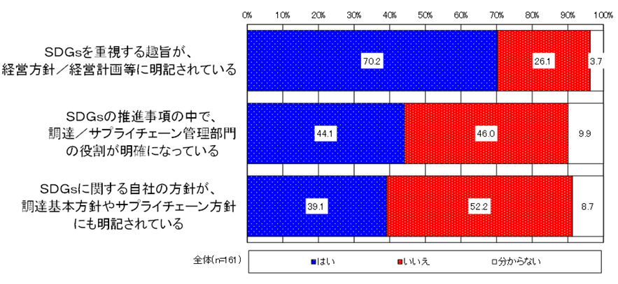SDGsを重視する趣旨が経営方針等に明記されている企業は7割に達するが、調達活動に関して具体的な事項まで落とし込んでいる企業は4割程度に留まる。