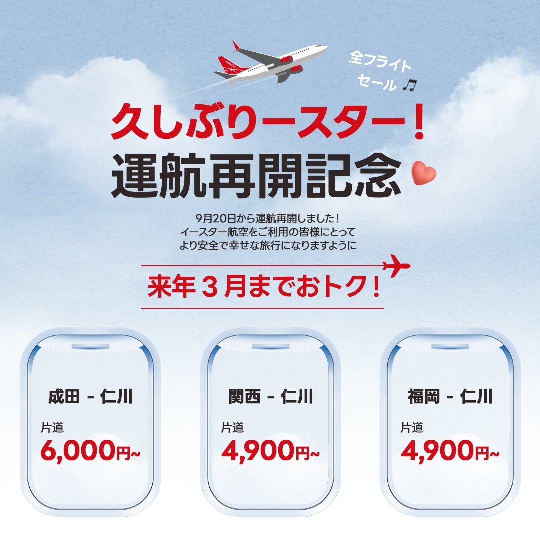これを記念し9月27日午後2時から10月3日までイースター航空のホームページ及びモバイルアプリ(ウェブ)を通じ特価キャンペーンを実施いたします。