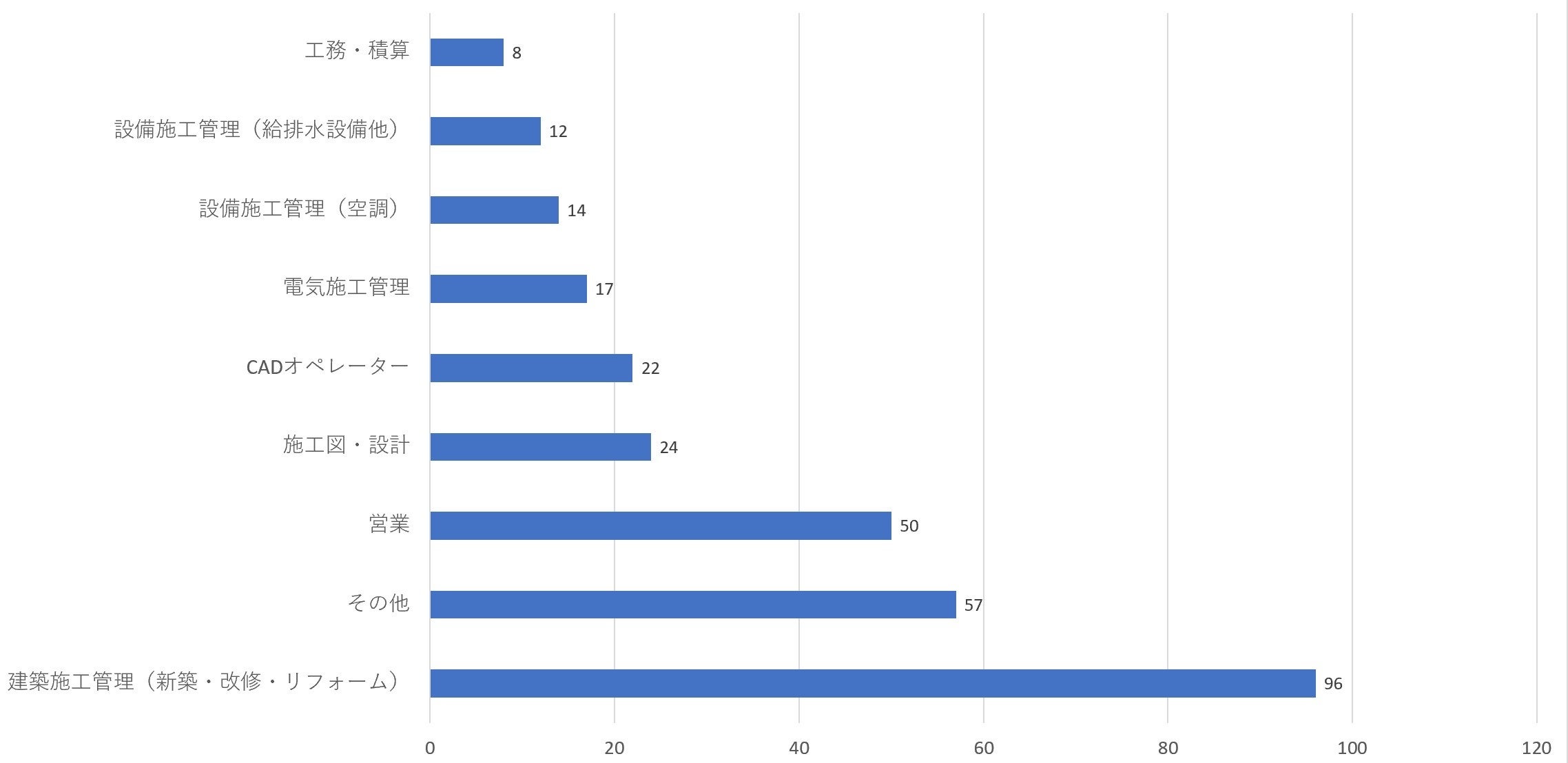 まず、「建築業界でもっとも長く経験した職種を教えてください」という設問では、96票を獲得した建築施工管理(新築・改修・リフォーム)が第1位となりました。