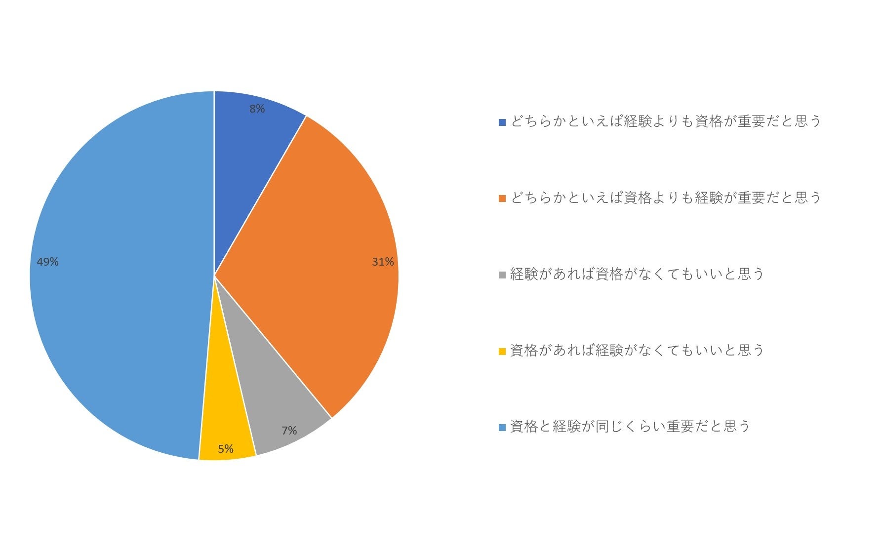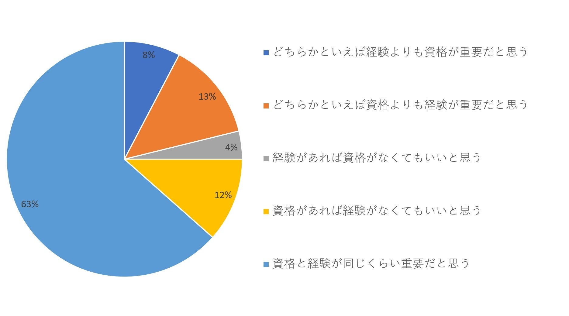 全体では49%だった「資格と経験が同じくらい重要だと思う」の回答が、63%という結果になりました。資格を持っている人の割合が大きいものの、全体の意見と同様に、資格と経験、両者を重んじる意見が大半を占めていることがわかります。
