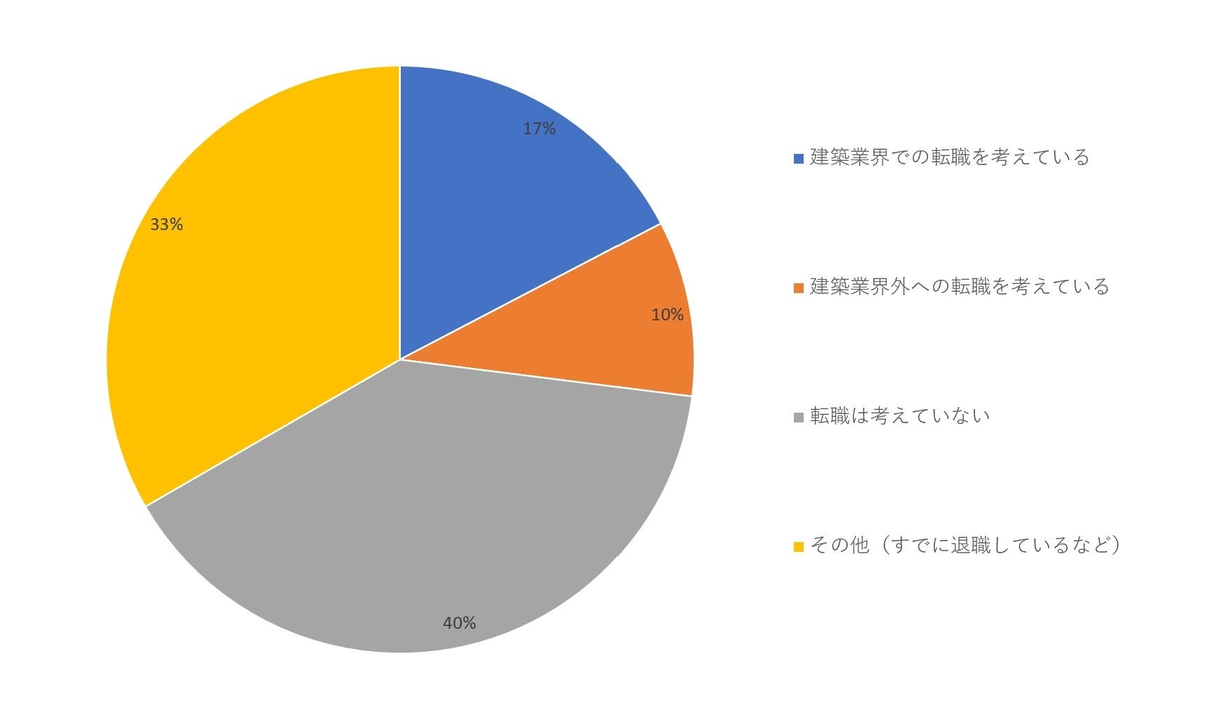 「建築業界での転職を考えている」が17%、「建築業界外への転職を考えている」が10%、「転職は考えていない」が40%、「その他(すでに退職しているなど)」が33%となりました。建築業界と建築業界外を合わせると、回答者のおよそ3割が転職に前向きであることがわかります。