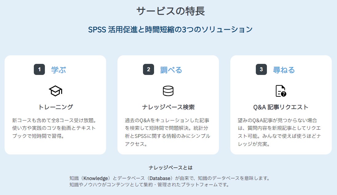 「学ぶ(トレーニング)」、「調べる(ナレッジベース検索)」、「尋ねる(Q&A記事リクエスト)」をキーワードに、SPSSユーザーがトレーニングでSPSSの基本操作や基礎分析を学び、分析を進めていく中で分からないことをナレッジベースで検索し、理解を深めていくことが可能です。ナレッジベース検索で見つからない情報は、質問内容を新規記事としてリクエストが可能で、使えば使うほどナレッジが充実していく仕組みとなり、SPSS導入後の課題を解決します。