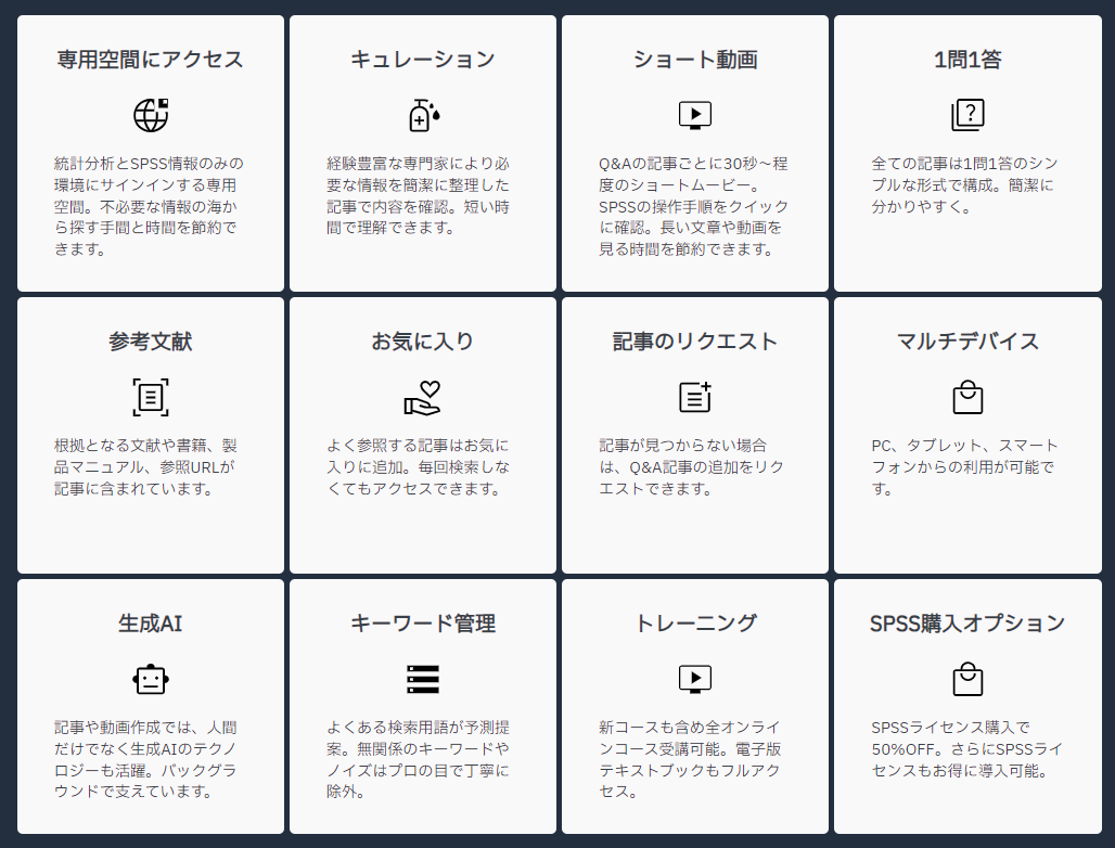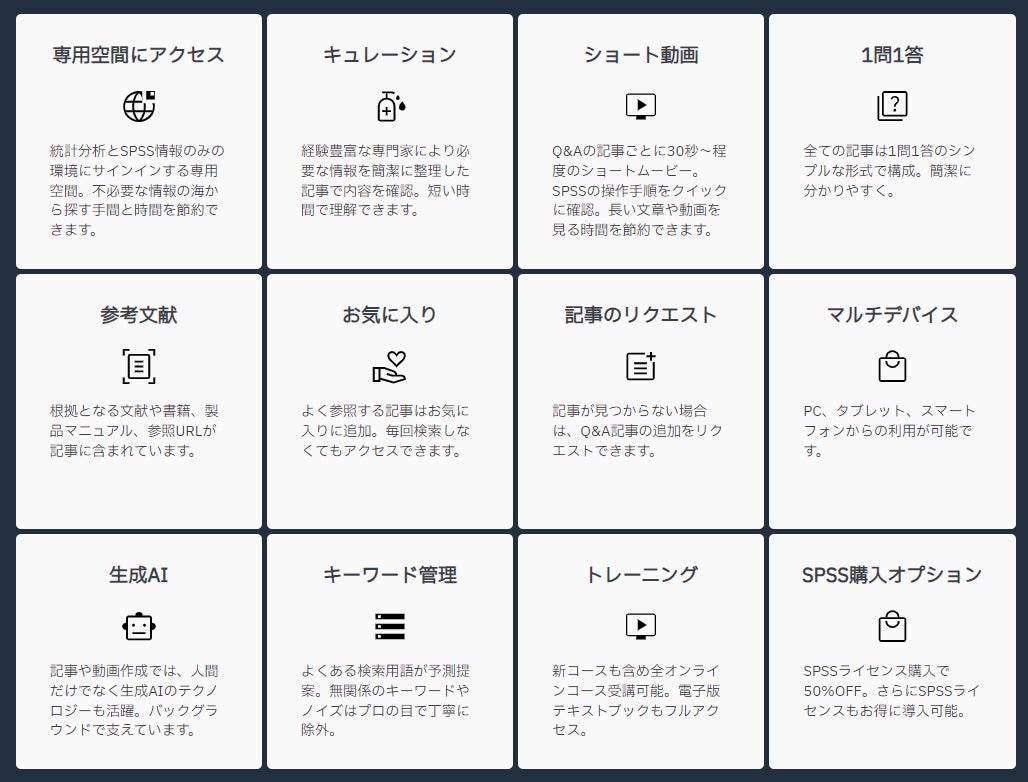 これまで、10,000件以上のSPSS導入と10,000時間以上の支援サービスの提供を続けてきた中で、SPSSユーザー様から多くのご意見や要望をいただきました。その中で生まれた新しいプラットフォームがSPSS QLINICです。ユーザーは、専用空間にアクセスすることで、SPSSに特化した情報や学習教材のみを検索・閲覧することができ、SPSS 活用促進と時間短縮を図ることが可能となります。1年間のモニター期間を終了し、2024年1月15日より一般販売を開始します。