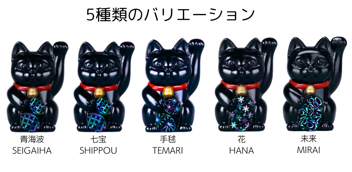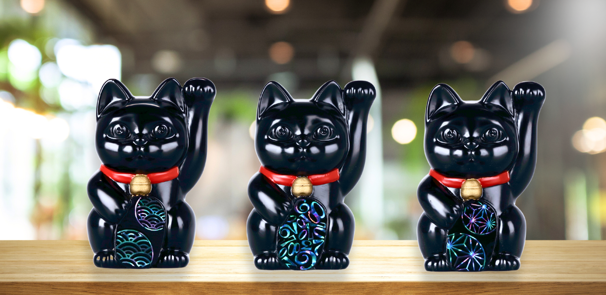 幸運の招き猫。上がった左手は集客、黒は魔除け、漆はラッキー7の意味があると言われます!風水にもよいとされています。猫の置物は玄関やリビングやオフィスのインテリアとしても美しく映えます。