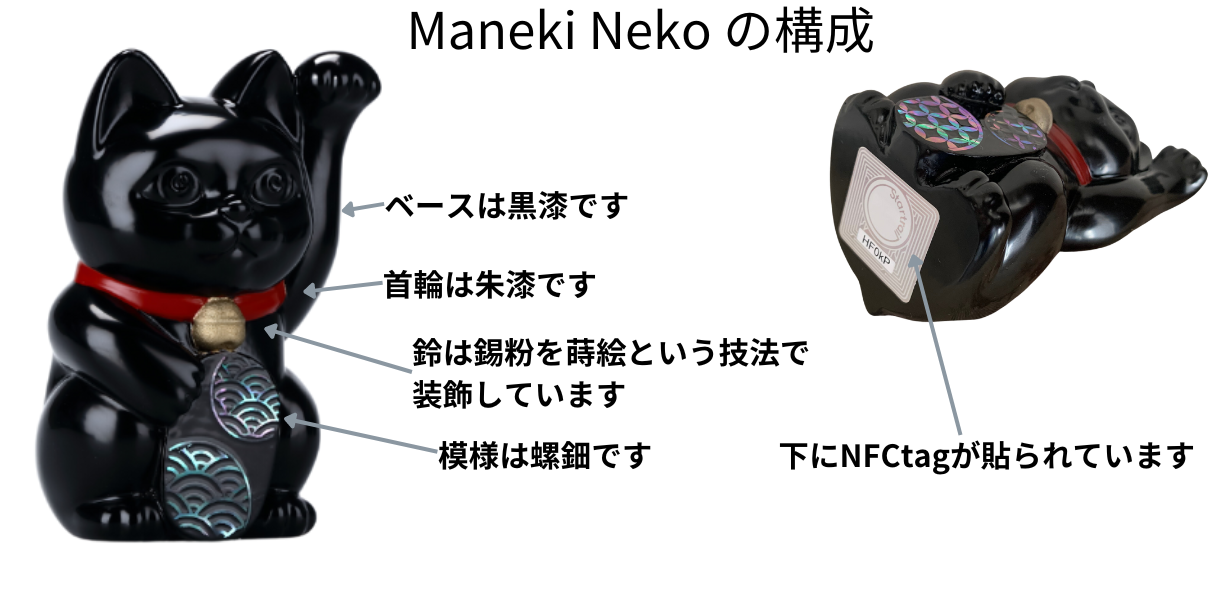 【職人×テクノロジー】 伝統工芸DX! デジタル価値を宿す「漆塗り幸運の招き猫」。ブロックチェーン使用の個体管理で持ち主変更時に更新できる所有者情報。スマホでタグを読み取り広げ続ける幸福の輪。