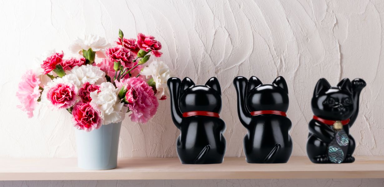 壱、弐、参・・・と続いていく漢数字(大字)の「七」にあたる漢字は「漆」です。漆には素数でラッキーナンバーの7という数字まで隠されています。黒色は魔除け、厄除け、幸運、商売繁盛の意味を持ちます。猫の置物を家の中に置くことは、風水的に良いとされています。最適な場所は、玄関やリビングなど人の流れがあり、人が集まる場所です。置物は少し高い位置に置くのが良いとされています。また黒色の招き猫は南西に置くと、病気や金銭面の問題を好転してくれると言われています。